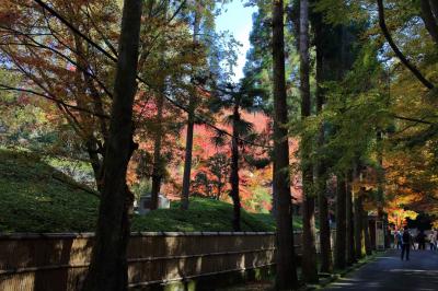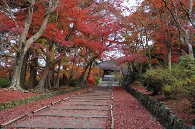 こちらの見どころは勅使門に続く石段を真っ赤に染める散紅葉でしょう。JR東海のCMで使われたこともあるので、ご存じの方も多いと思います。ですが、この景色を撮るのは難しく、何度か訪れていますがなかなか撮れません。まず、石段の両脇の紅葉が十分に紅葉していないといけませんし、散っている紅葉が枯れてしまっていると風情が半減します。掃き清められているのか、紅葉が無いこともあります。また、普通に石段を上って勅使門下の馬場に行くこともできるので、日中の時間帯だと人が石段を上っていてそもそも景色が撮れません。残念ながら今回は紅葉がありませんでした。
