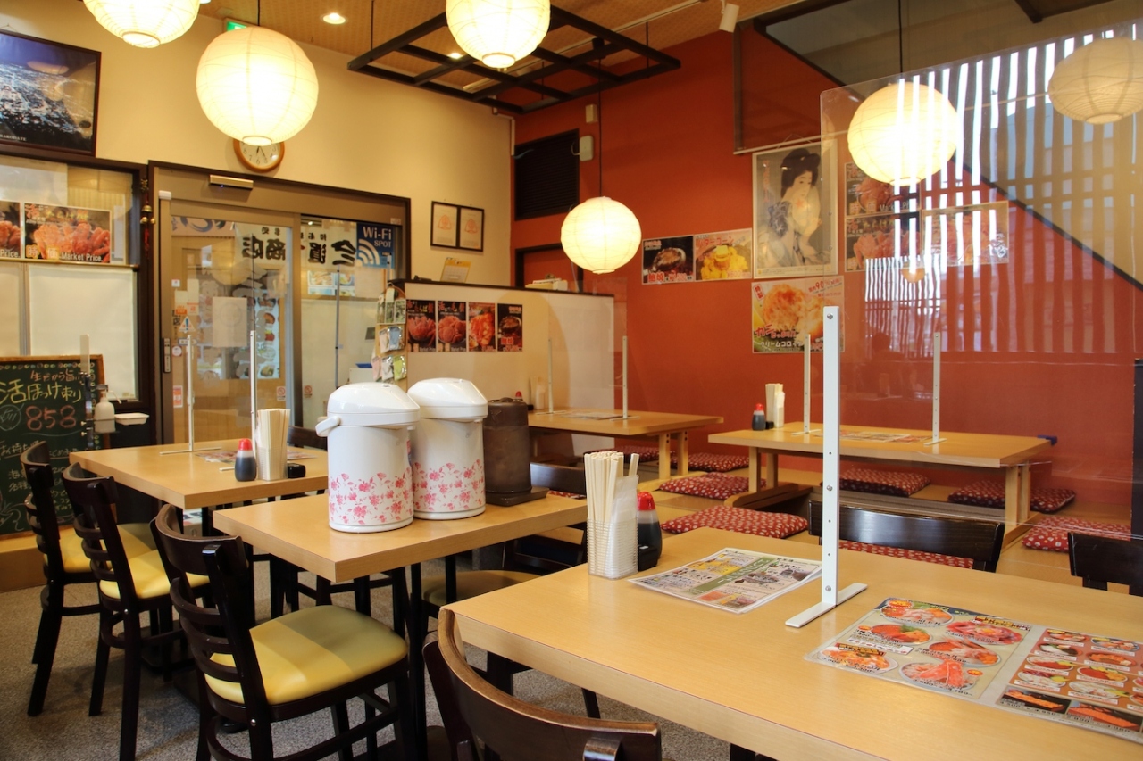 どんぶり横丁には色々な店が入っていますが、やはり有名店は混んでいたため、ご時世を考えてゆったりと座れそうなこちらに入りました。因みに、入り口に書いてある通りご飯とみそ汁はお替り自由です。