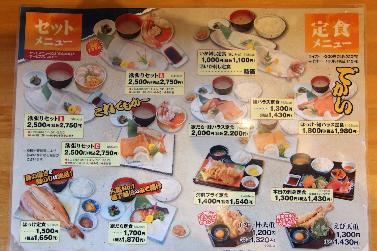 市場とは銘打っていますが小売店の集合体です。駅二市場を中心に、朝市広場やどんぶり横丁、商店や飲食店がひしめいています。北海道らしく、どちらの商店も主力はカニ、鮭、いくら、ホタテなどでした。また、当然函館名物のイカも並んでいました。
