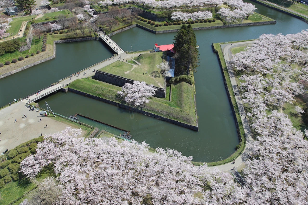 現在は桜の名所として有名な五稜郭ですが、実際に行くと圧倒されます。堀の北と西側は桜に囲まれていますし、内部の土塁の周りにも一面に桜が植えられています。特に、土塁の方は土塁の上だけでなく、土塁の内側や土塁よりも低くなっている外側(堀側)にも桜が植えられているので、上下左右から桜に囲まれている感覚を味わえます。桜のトンネルが有名な場所は多いですが、こちらのように足元も桜で囲まれている感覚を味わえる場所は中々無いと思います。