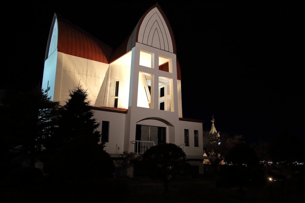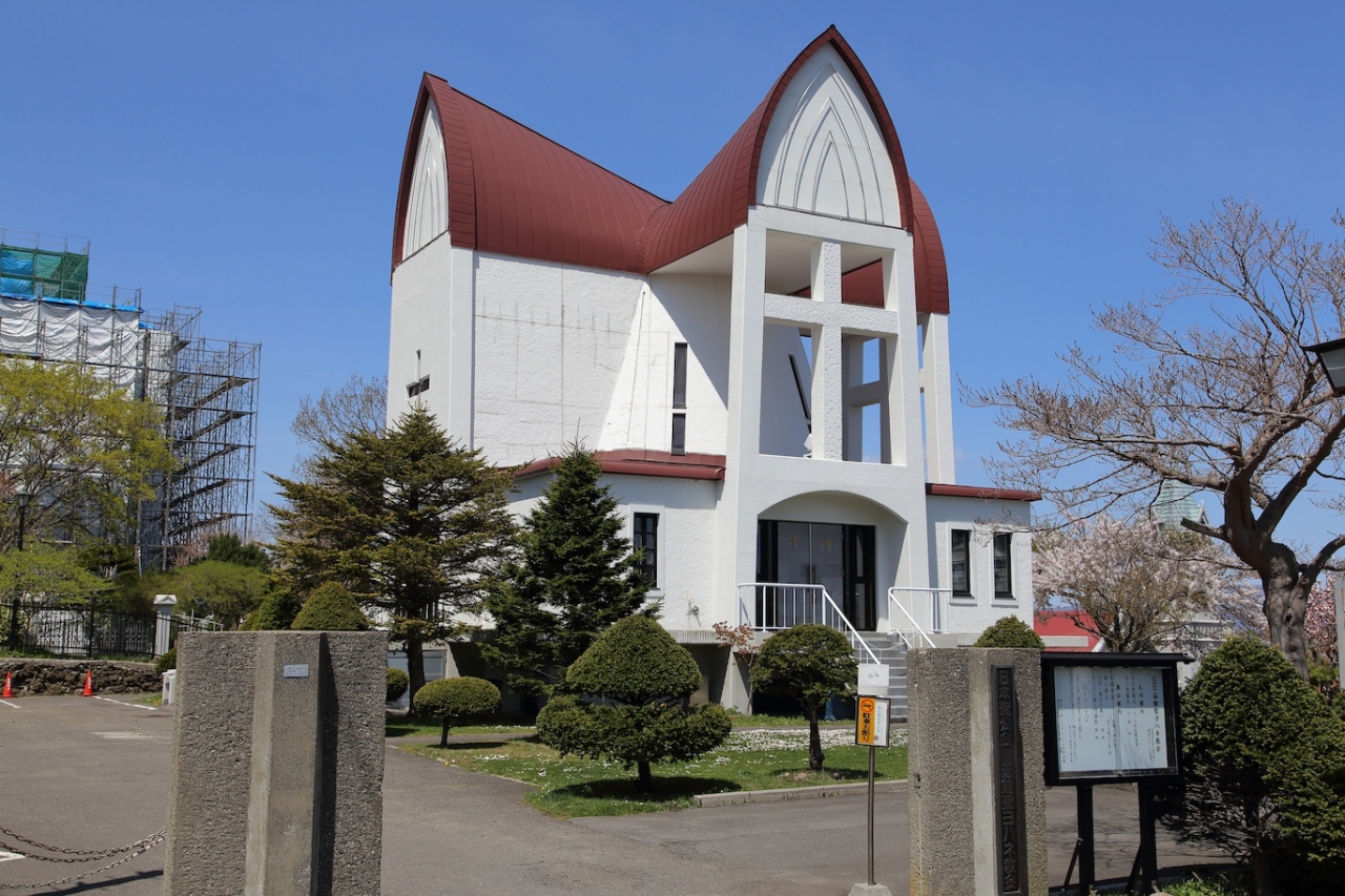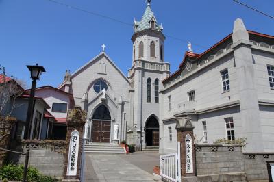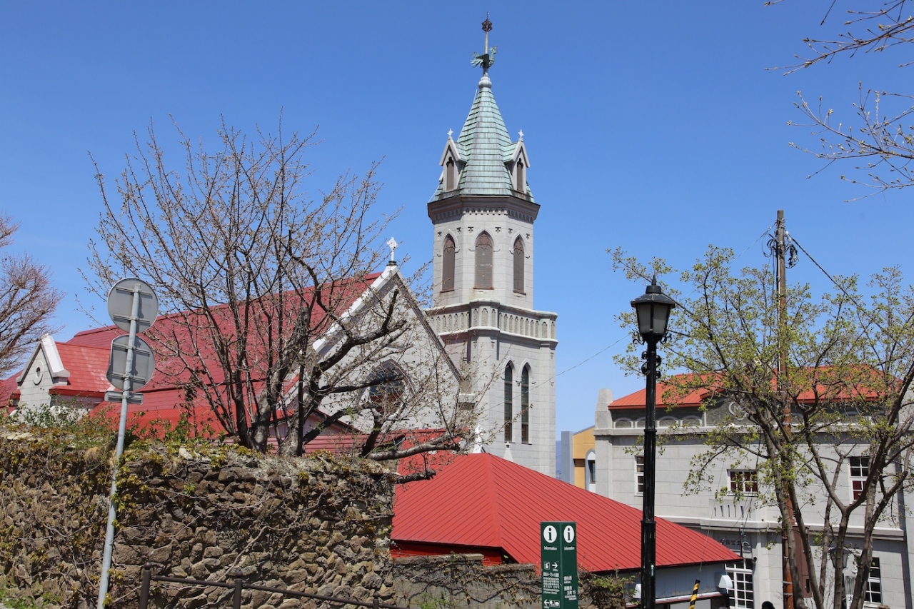 函館の教会群の1つで、大三坂に面して建つカトリックの教会です。ゴシック建築の落ち着いた建物で元町に溶け込んでおり、函館のハイカラなイメージを作り出すのに一役買っています。実際、八幡坂の辺りから見ると桜に覆われた赤い屋根と尖塔、石畳の道が素晴らしい景観を作っていました。