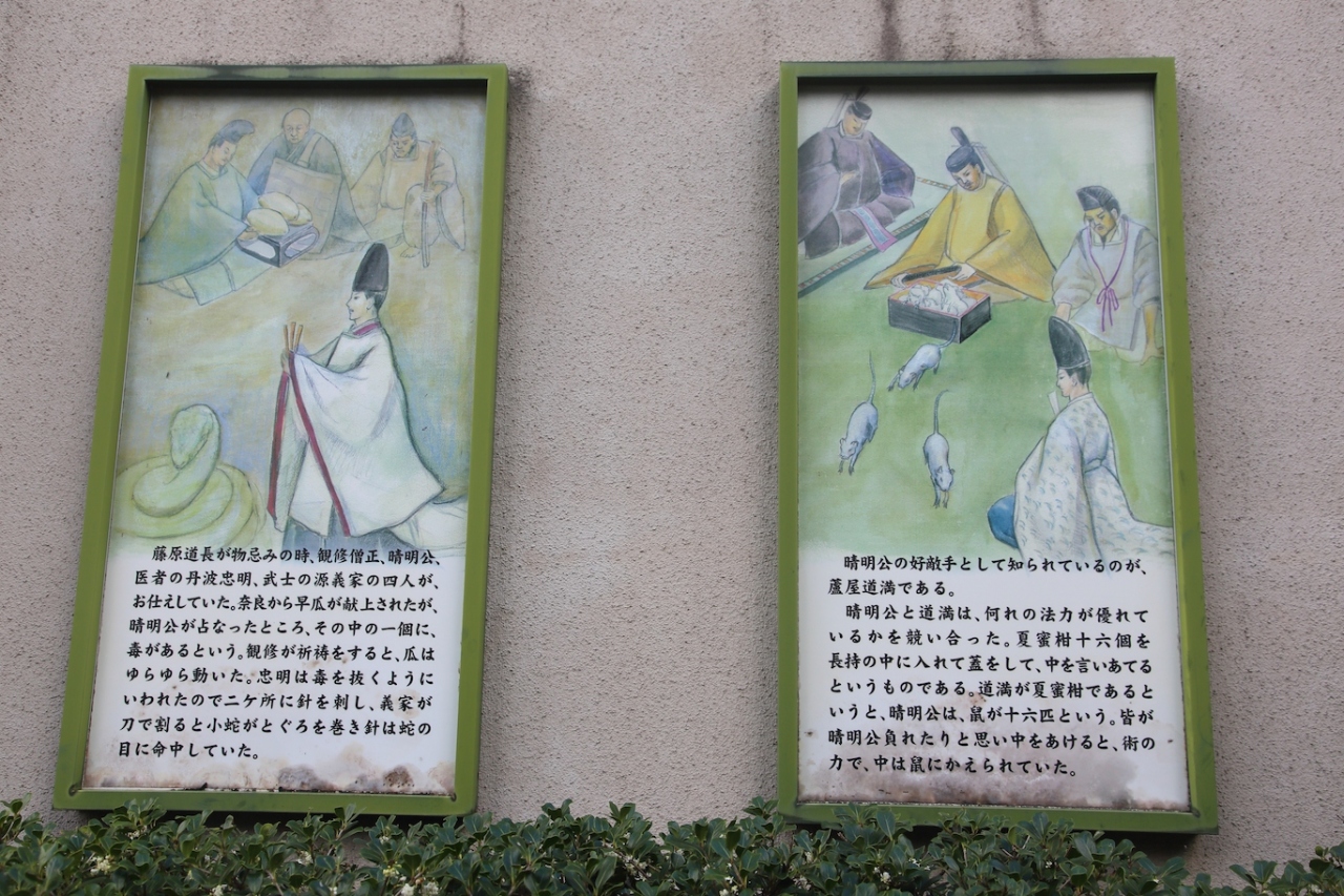 陰陽師として著名な安倍晴明公が住んでいた場所、っていうのが主な理由のようですが、パワースポットとして有名なようです。次から次へと参拝の方が訪れていました。あと、陰陽道で厄を払うとされる桃をかたどった厄除桃や、晴明公が陰陽の技で湧き出させたとされる晴明井があったりして、そちらも人気でしたね。因みに境内には安倍晴明公の銅像もおいてありましたが、夢枕獏氏の小説で抱いていたイメージとはちょっと違いました。また、境内の壁には晴明公の逸話が書かれていました。個人的にはそちらが面白かったですね。- 旅行時期
