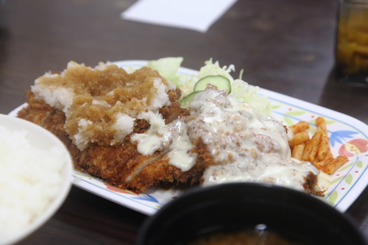 基本的に学生さん向けの洋食屋さんなので、価格が安くボリュームたっぷり、が基本です。こちらでは2色ジャンボチキンカツを頼みましたが、チーズソースとおろしポン酢を掛けた大きめのチキンカツ、ご飯とみそ汁で700円程度でした。味は十分に美味しかったです。飛び抜けて美味しい、というわけではありませんが、チキンカツは揚げたてでしたし、価格とボリュームを考えると十分に満足いくものでした。なにより、自分自身が学生時代に仲間と一緒にこういった食堂で食べていましたから、その懐かしさが余計に美味しく感じさせたのだろうと思います。