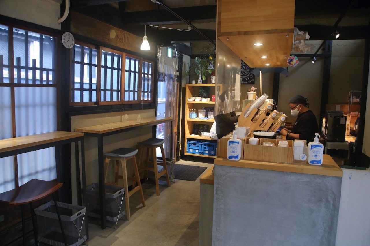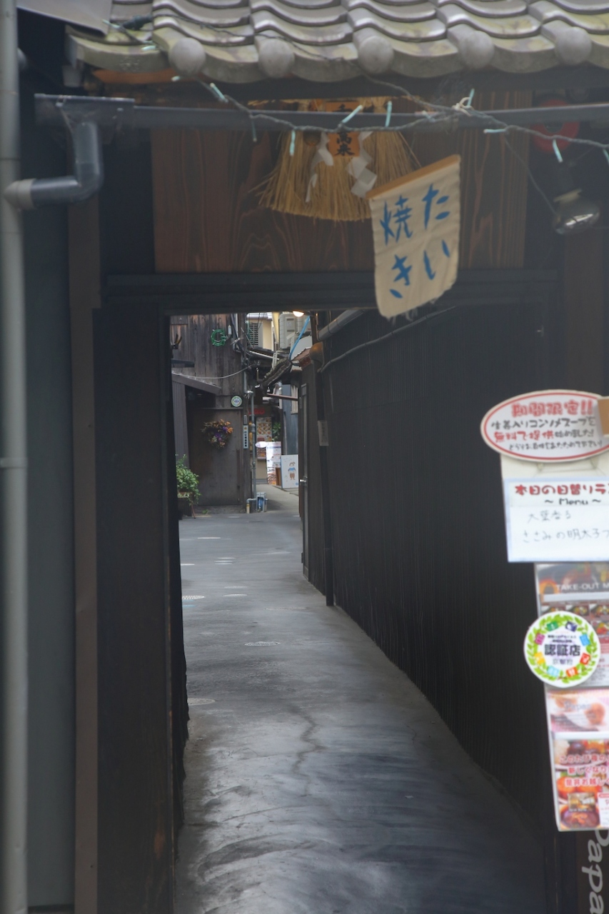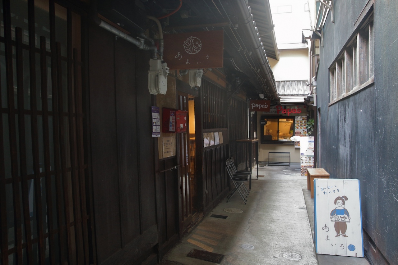 仏光寺通りの路地裏にあるたい焼きとコーヒーのお店です。四条駅の6番出口を出て、京都駅方面に向かって最初の通りを右手(西)側に向かって進むと、左手側に『たいやき』と書かれた布がぶら下がっています。その路地を進んでいくとあります。