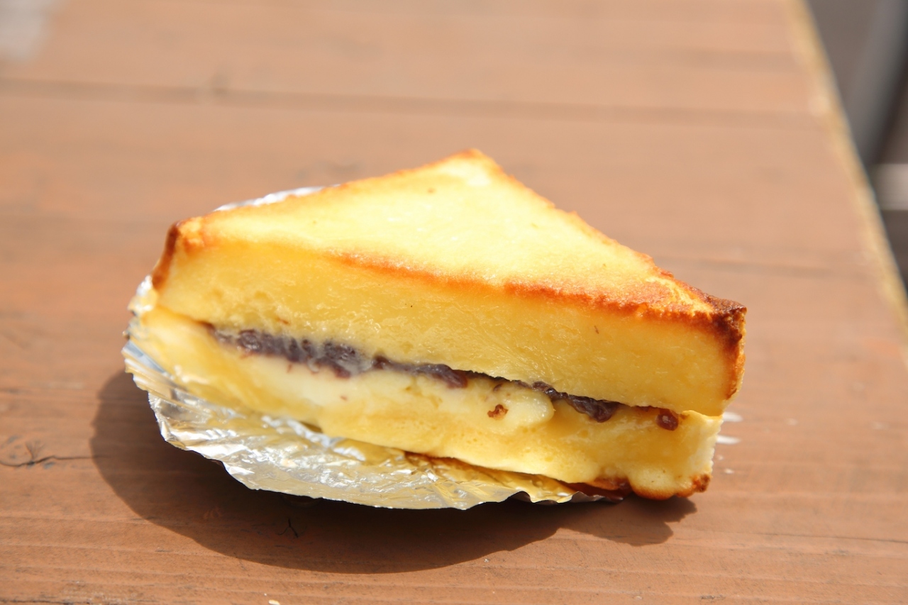 土佐清水はサバで有名なのですが、サバの切り身を甘辛く味付けし、トマトとレタスにマヨネーズを一緒に挟んだ、ある意味王道の組み合わせです。トルコのサバサンドのように、サバとパンの組み合わせは鉄板なので、間違いない味でした。トライアングルもあんことクリームチーズが挟まっていて美味しかったです。