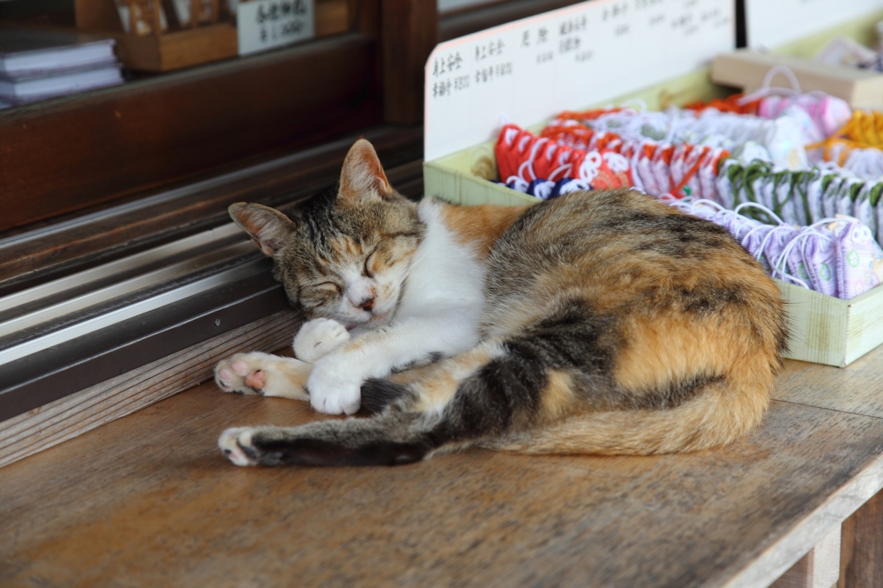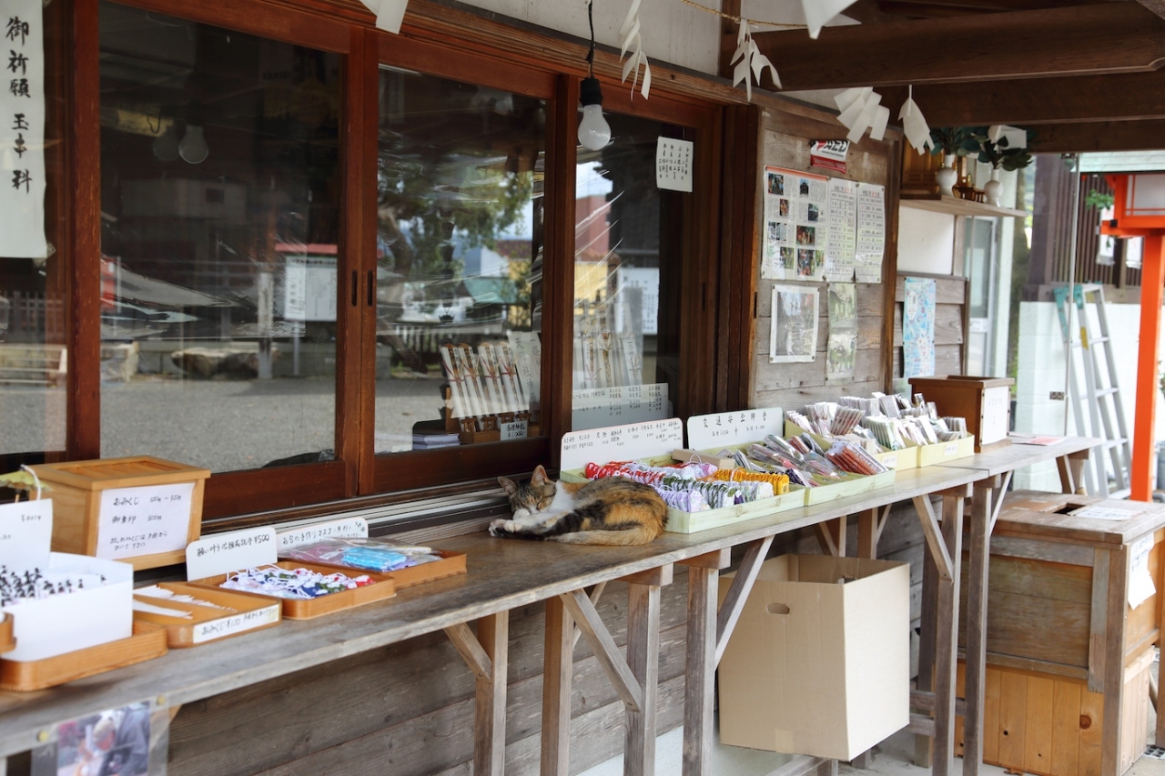 こちらで有名なのは神社で飼われているネコのチビちゃんでしょう。元々は迷いネコだったようですが、神職の方に拾われ、神社の看板猫として活動しています。私が訪問した際も社務所で昼寝していました。