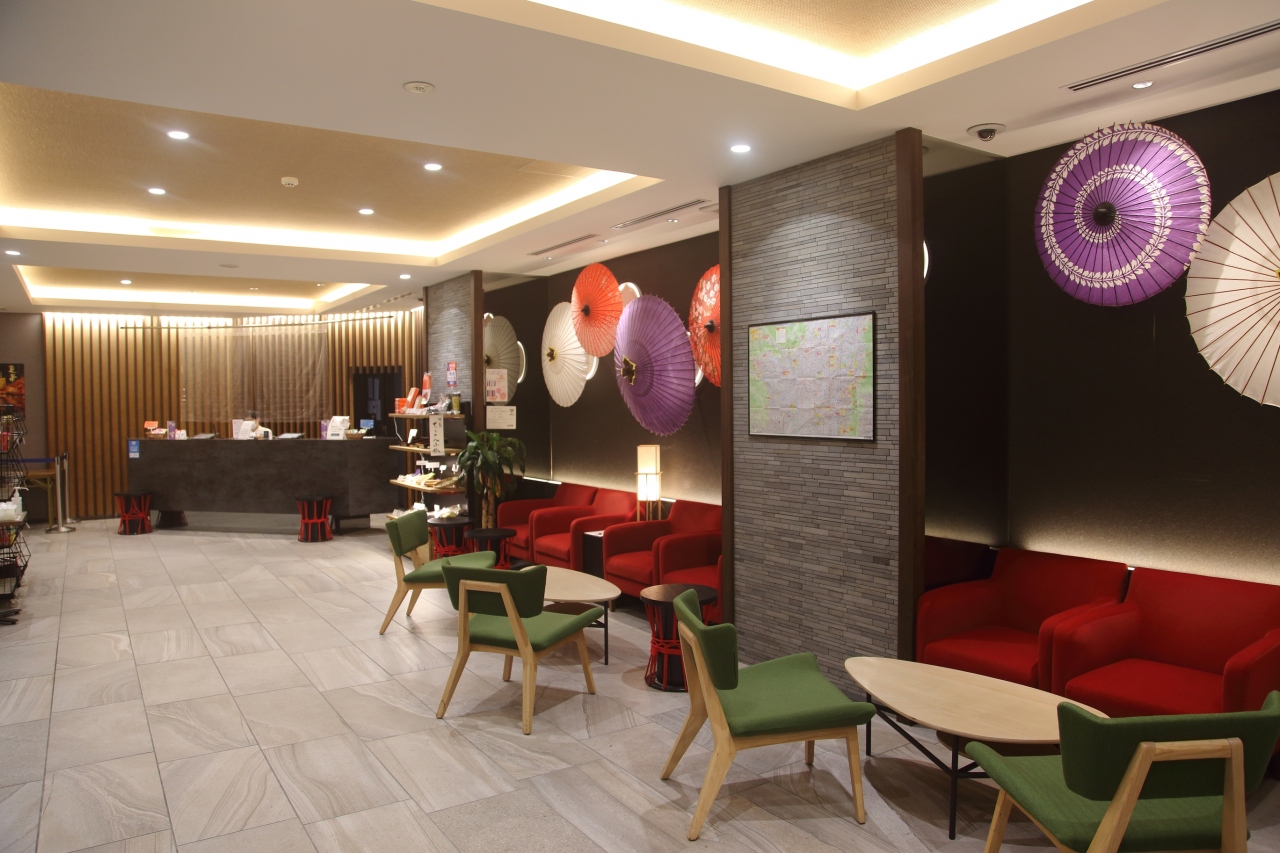 ホテルの建物はまだ出来たばかりのようで、内装は綺麗でした。京都という土地柄だと思いますが和のイメージを前面に押し出していて、ロビーや廊下に和傘が飾ってありました。