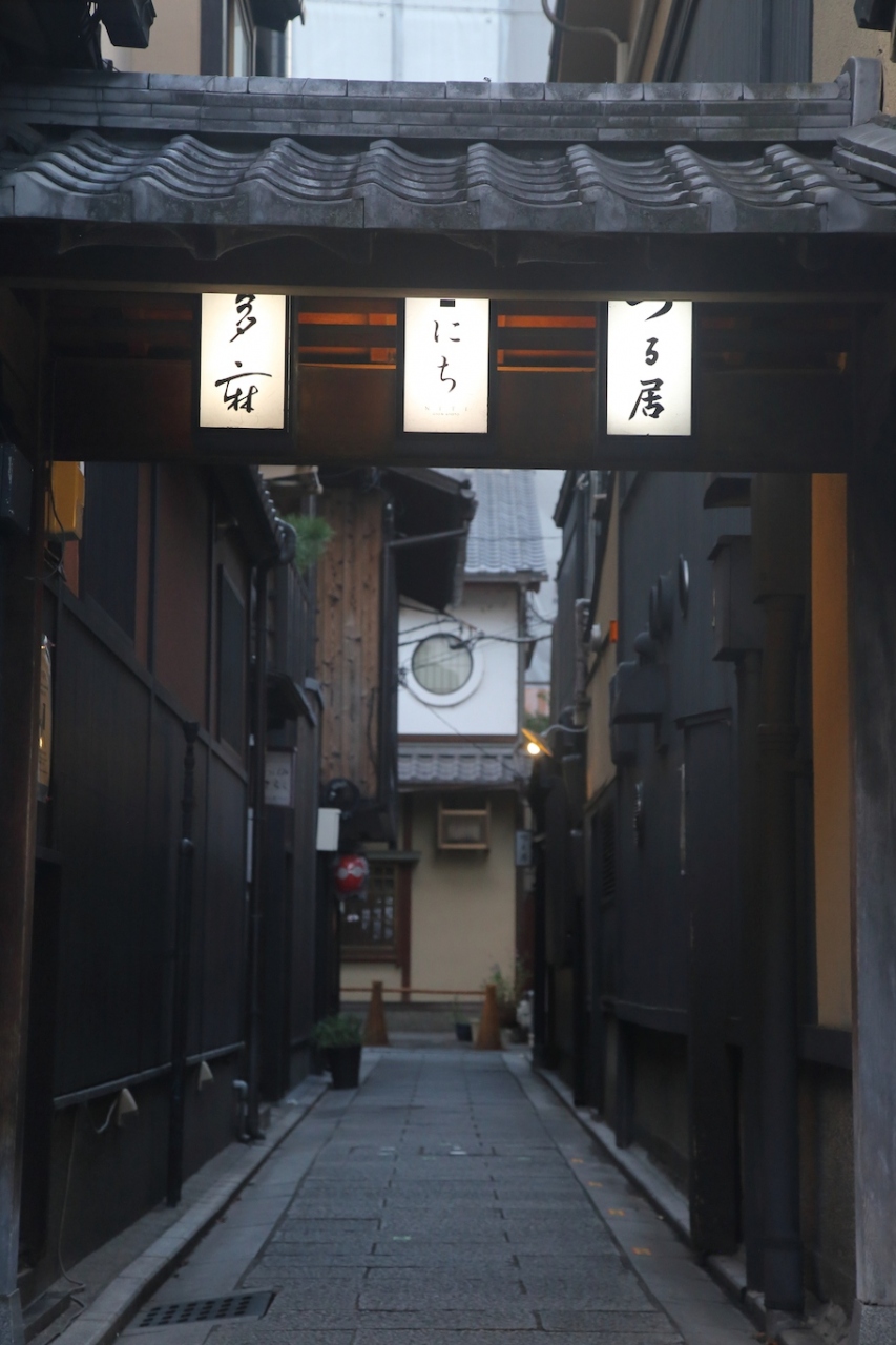 こちらに行かれるなら是非一本裏の通りを歩いてみてください。メインストリートを歩くだけでも雰囲気は味わえますが、一本裏の通りに入ると狭い道を挟んでお茶屋さんや置屋、飲食店が並び、雰囲気がギュッと凝縮されています。落ち着いた京都の花街をより強く感じることができるので、お勧めです。なお、写真撮影を禁止されている通りもありますので、その点は注意してください。- 旅行時期