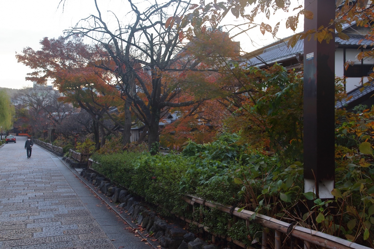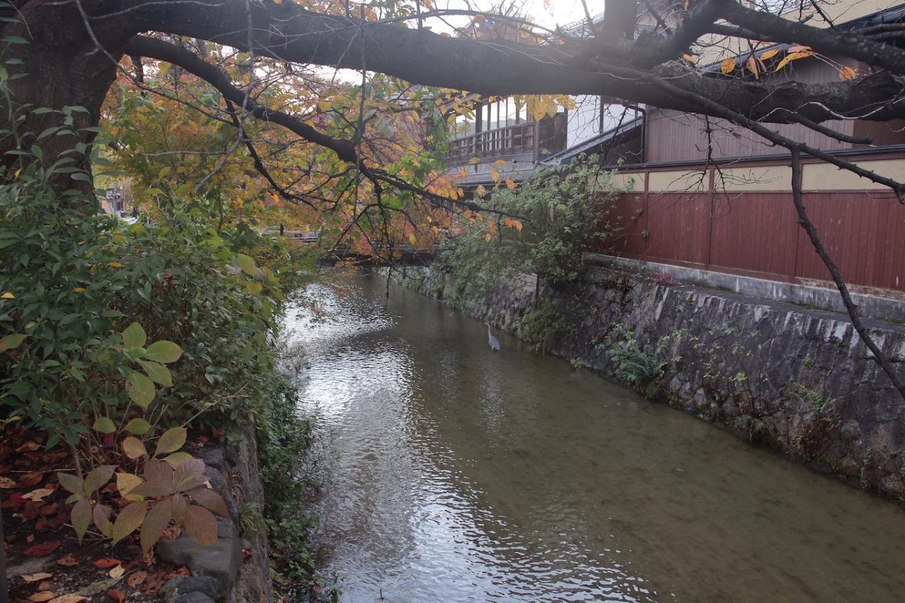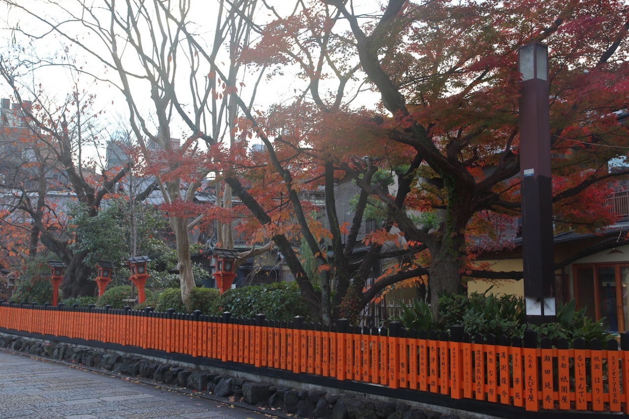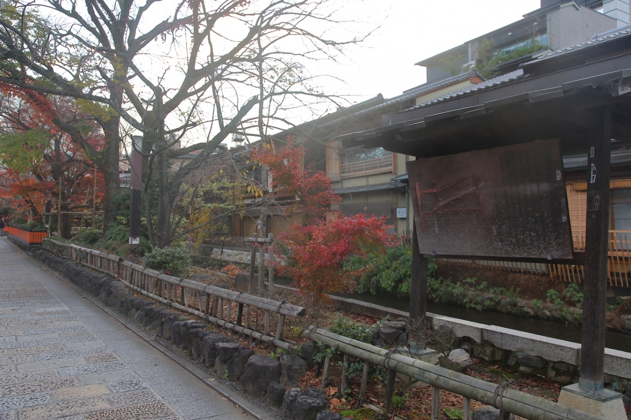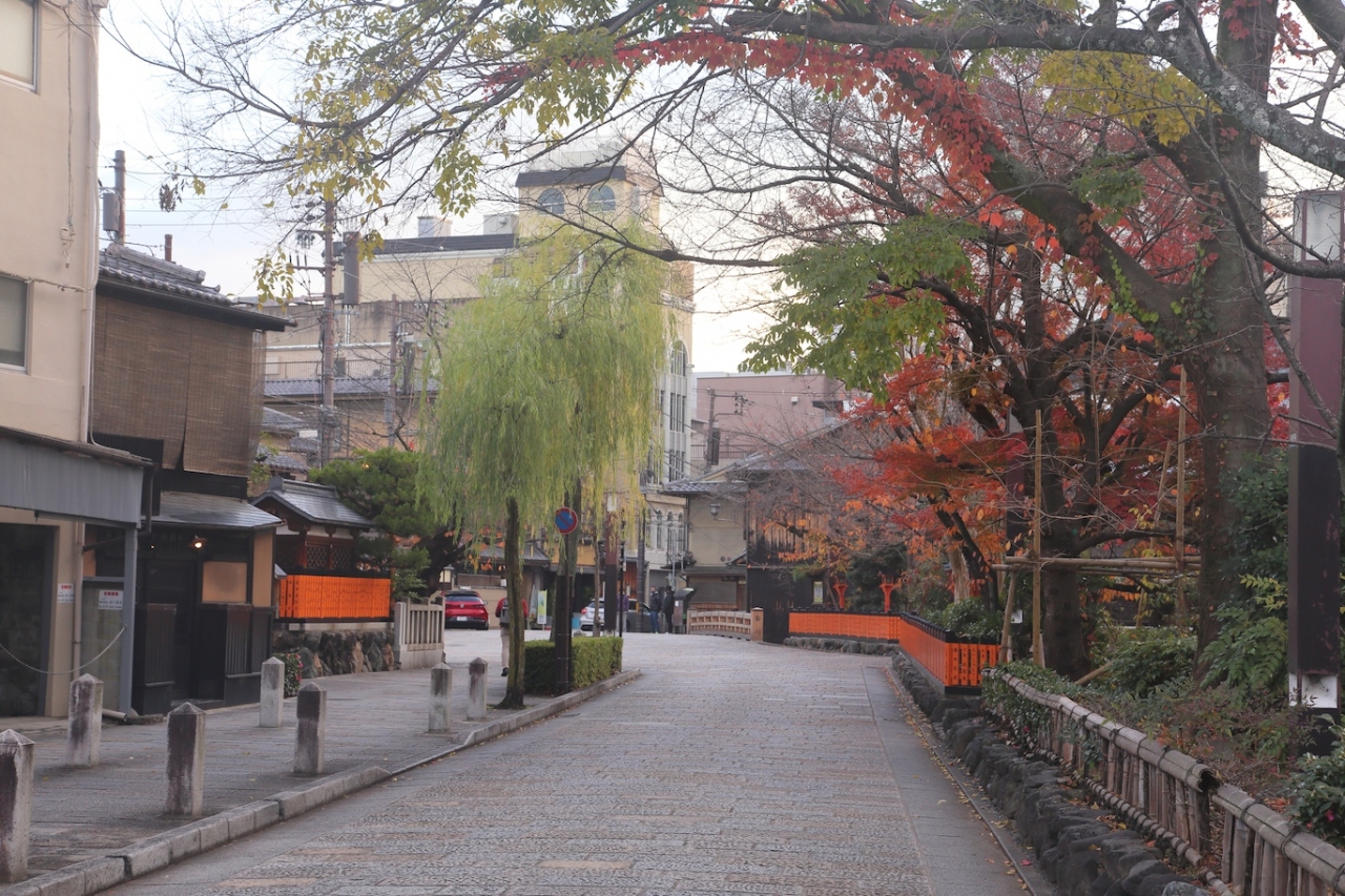 白川沿いに並んだ古い家並みが落ち着いた京都の雰囲気を色濃く残しており、散策にはおすすめの場所です。白川沿いには紅葉する木々が植えられているので、紅葉の時期は町屋の雰囲気と相まって楽しませてくれます。私が行ったのは12月の頭だったので終りかけでしたが、まだ楽しめました。あと、一本北側の新橋通りには花見小路と同じような街並みが並んでいます。白川通りだけ歩いて満足する方も多いですが、そちらも歩いてみると良いと思います。