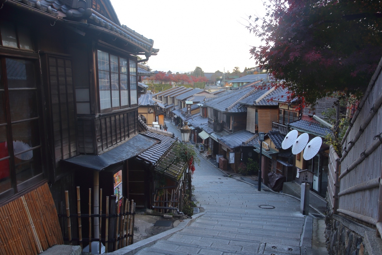 高台寺から清水寺へ続く参道の一部です。伝承では豊臣秀吉の妻であるねねが、高台寺のあたりから清水寺に安産祈願のお参りする際に通ったために三寧坂(三年坂)と呼ばれるようなったそうです。因みに、高台寺方面に下っていくと二年坂(二寧坂)と一年坂(一念坂)があります。
