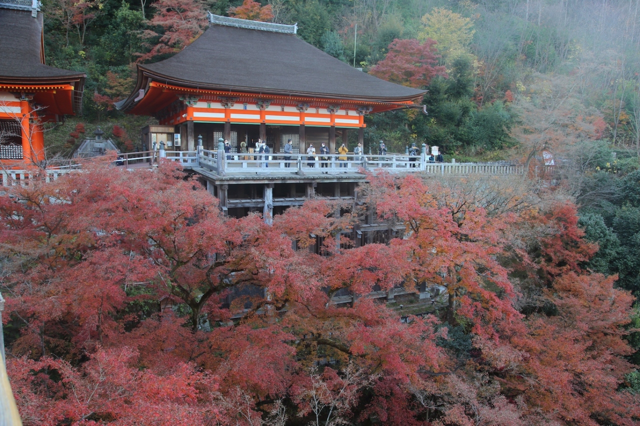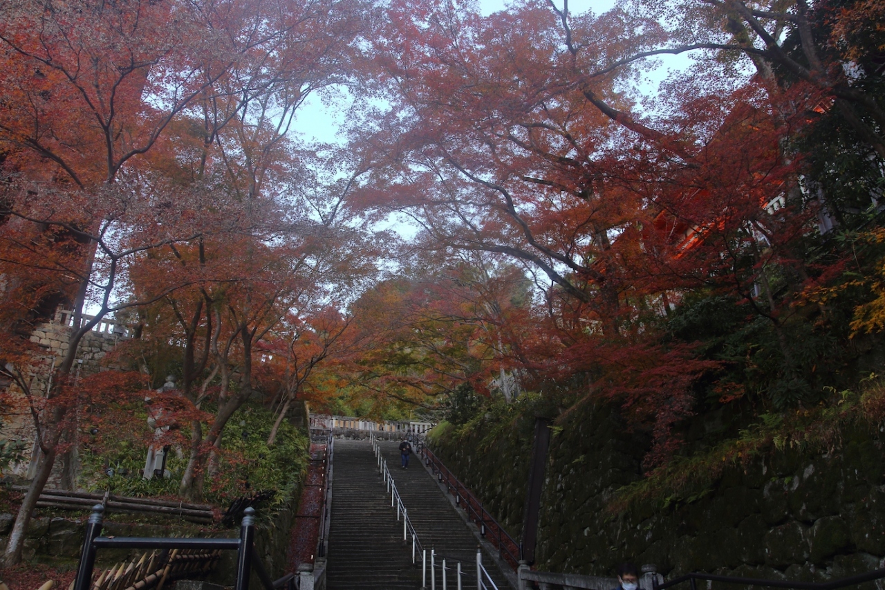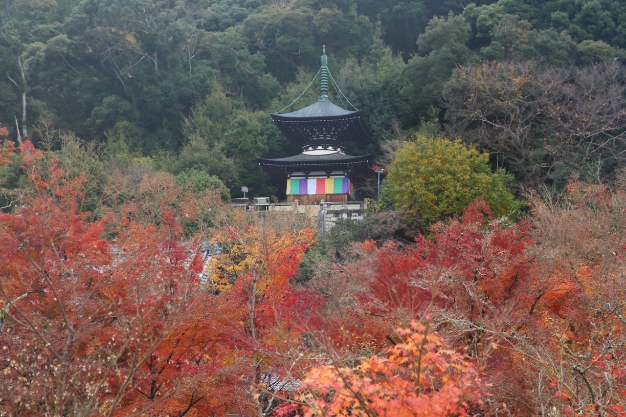 四季を通じて素晴らしい景色を見られますが、特に紅葉の時期は素晴らしいです。本堂や子安塔の周り、音羽の滝へ下る階段、音羽の滝から舞台の下を通る道、西門や三重塔の下にある放生池の周りなど、見応えのある場所が沢山あります。今回は12月の訪問だったので残念ながら紅葉は終りかけでしたが、それでも十分に楽しめました。