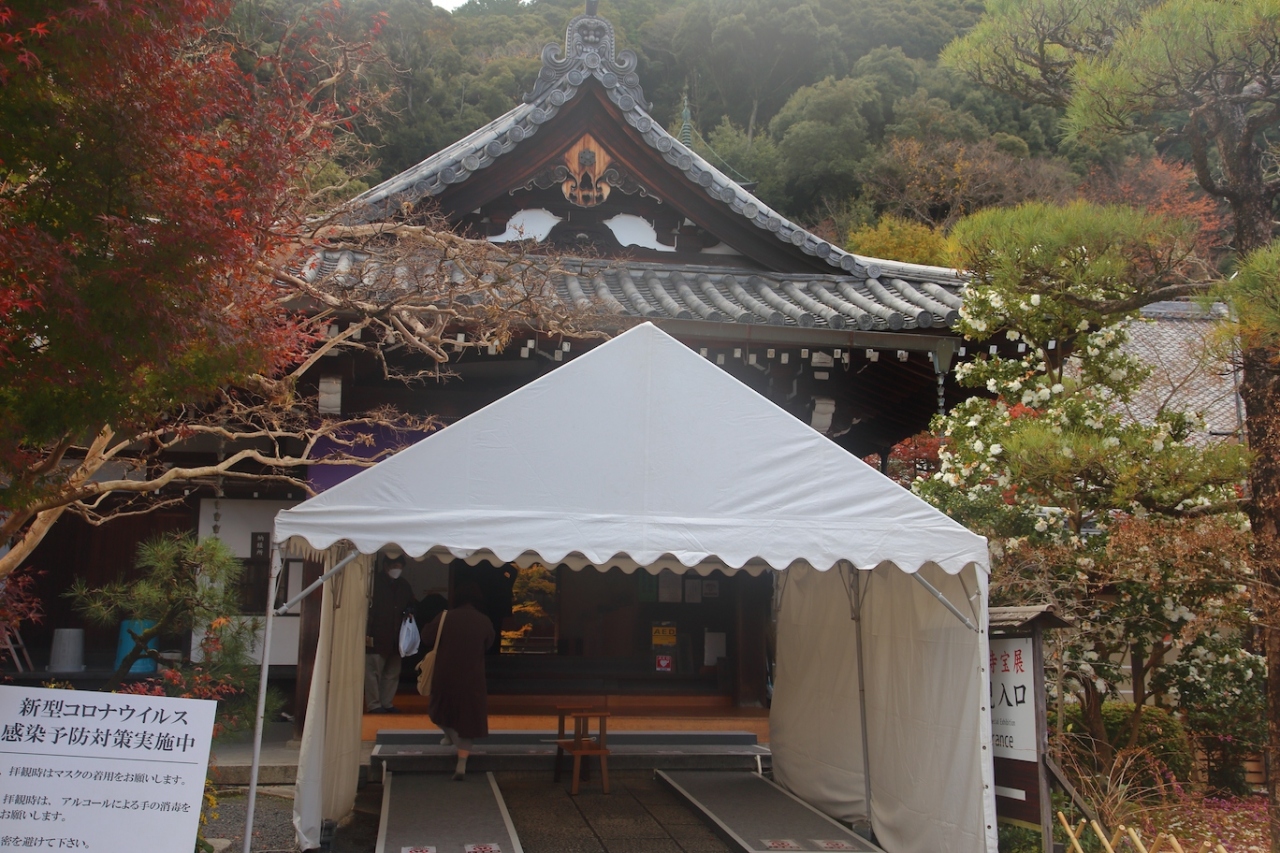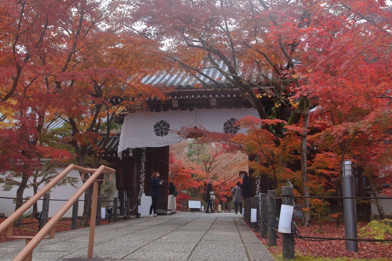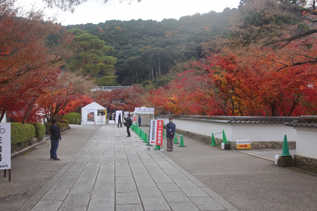 見返り阿弥陀で有名な寺院ですが、紅葉の名所として京都でも屈指の場所としても知られています。実際、総門の前から中門に至る参道を歩くだけで、山の緑と紅葉の赤、白壁の美しいコントラストを見ることができます。