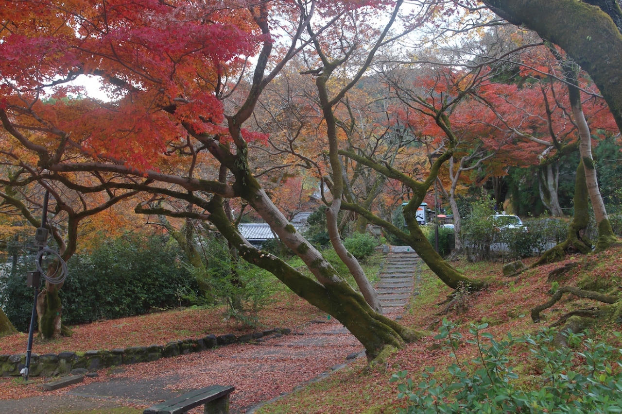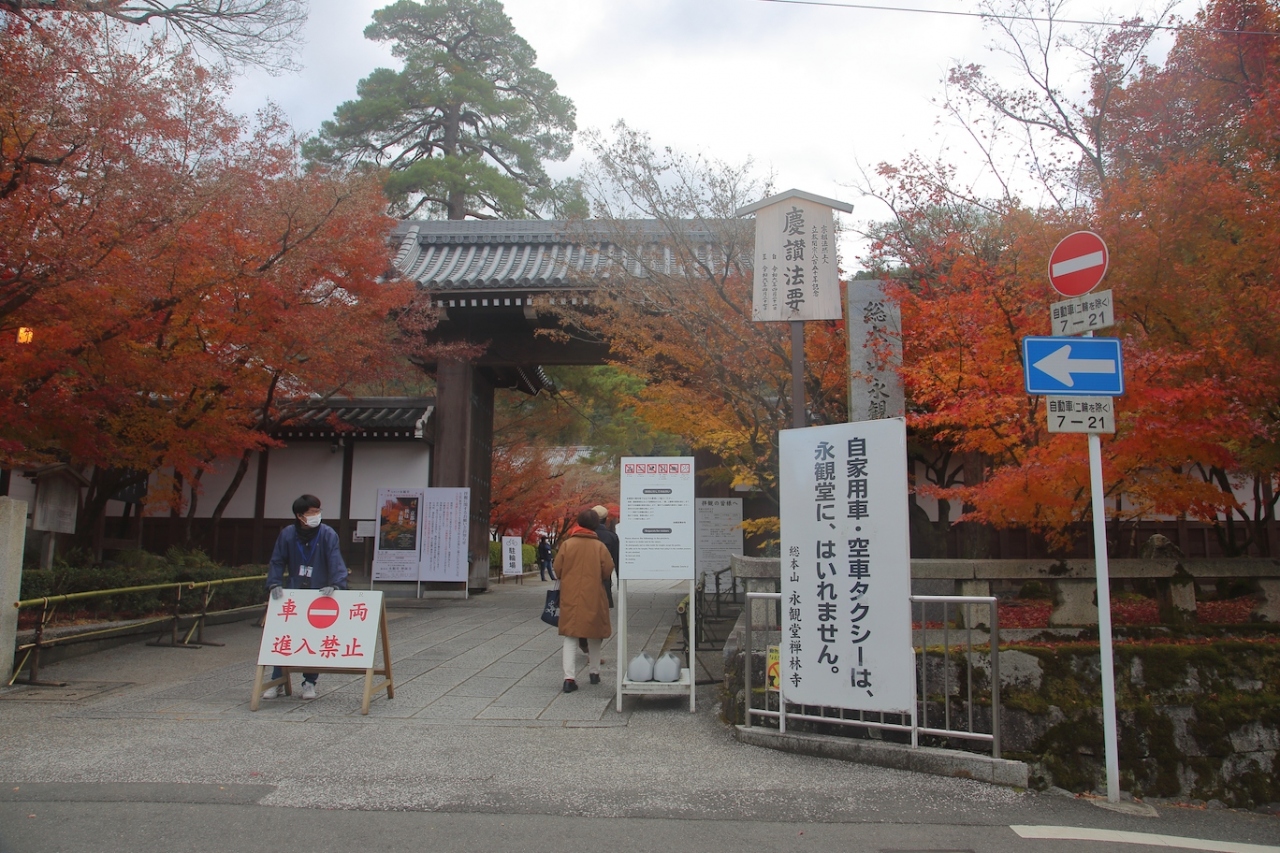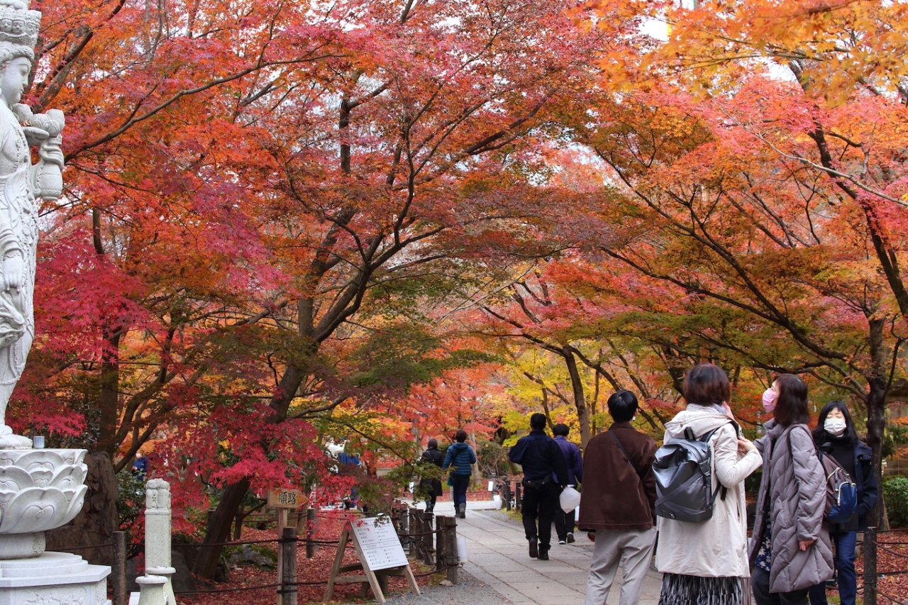 見返り阿弥陀で有名な寺院ですが、紅葉の名所として京都でも屈指の場所としても知られています。実際、総門の前から中門に至る参道を歩くだけで、山の緑と紅葉の赤、白壁の美しいコントラストを見ることができます。