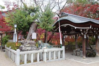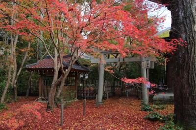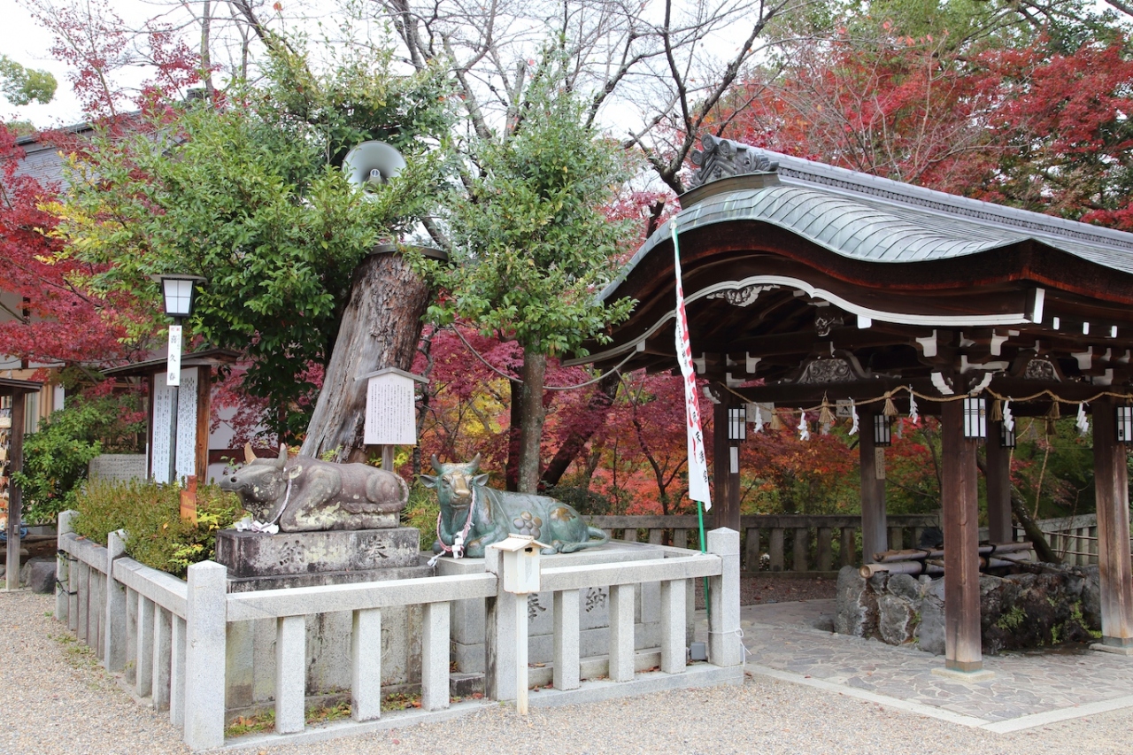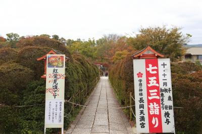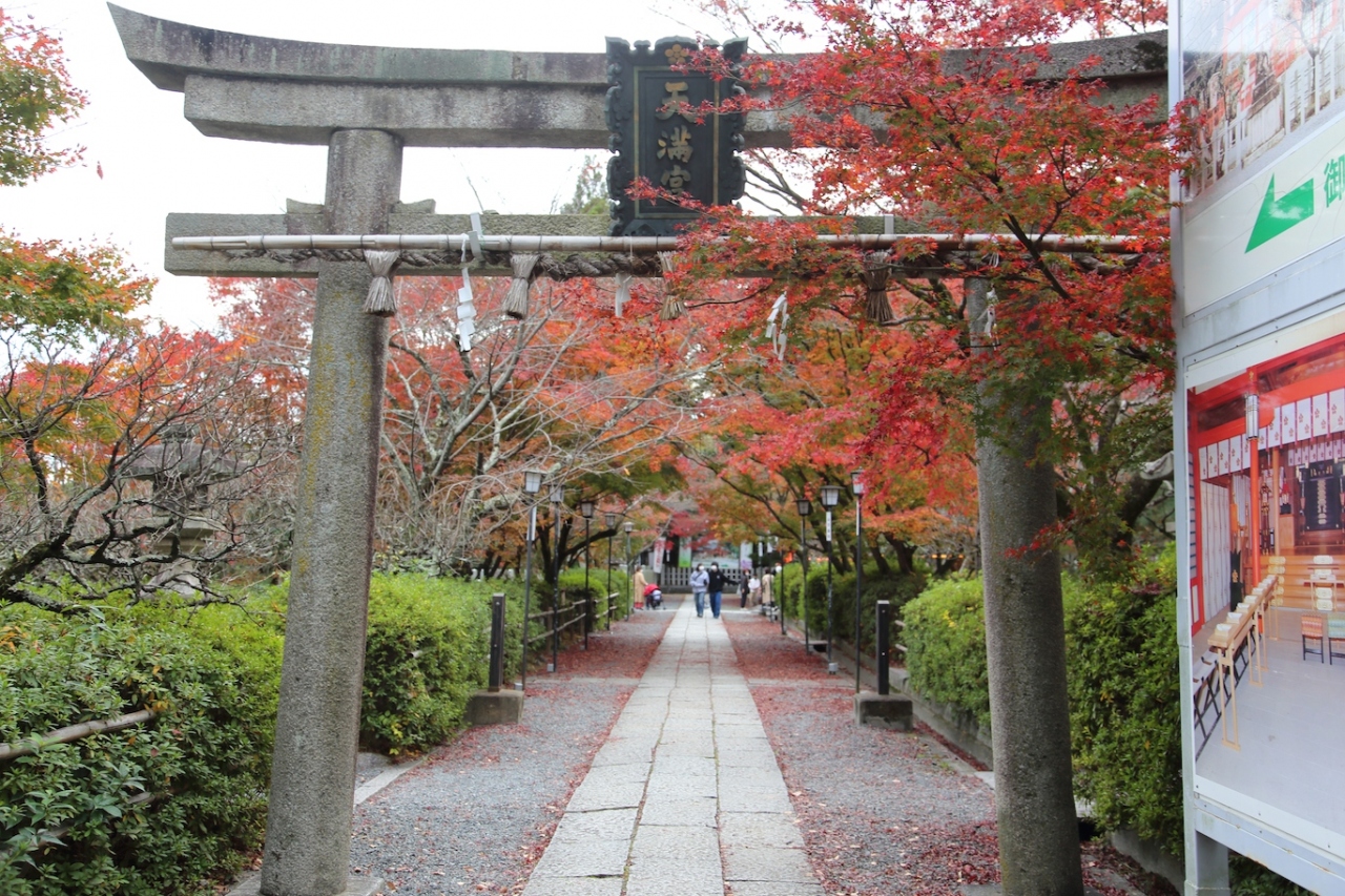 長岡京市にある天満宮で、社地は元々菅原道真公の領地だったそうです。菅原道真公の没後、従者だった方が創建された歴史のある神社です。紅葉の名所でもあり、実際に境内は美しい紅葉で彩られていました。