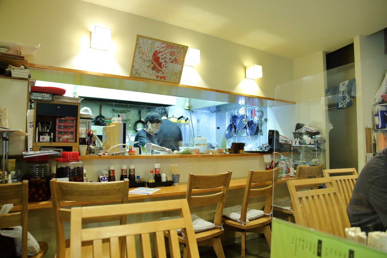 中は小ぢんまりとしていて、カウンターとテーブルが幾つか、という感じです。ただ、今はコロナの影響でカウンターは使用されていないようでした。また、お弁当を取りに来ていた方も居たので、持ち帰りにも対応しているのだと思います。