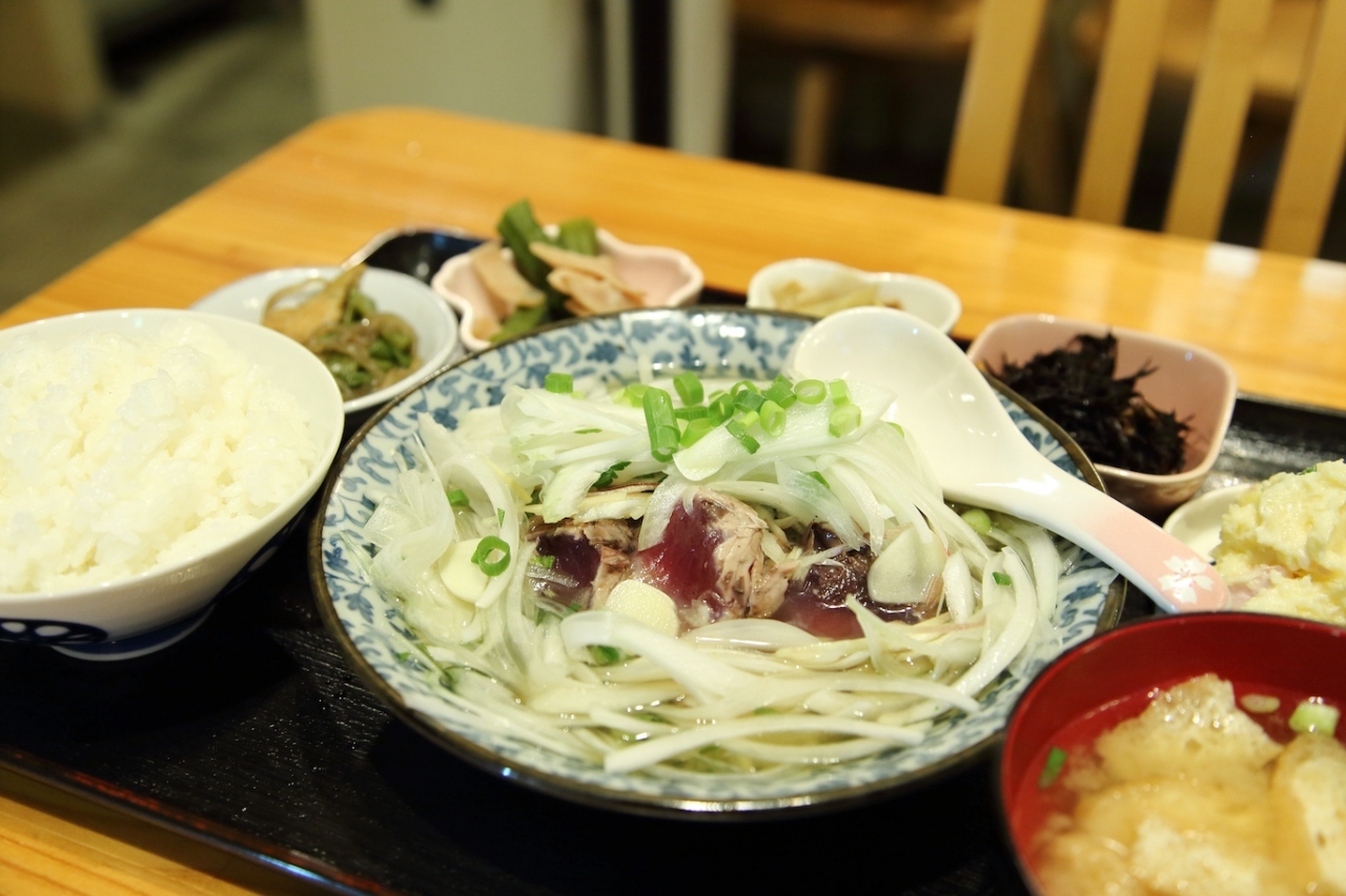 こちらはメインの1品に小鉢が5品ほどつく鉄丸定食が人気のようですが、折角高知に来たのだからと、カツオの田舎たたき定食をお願いしました。田舎たたきがどういうものか判らなかったので訊いてみたところ、女将さんからカツオのたたきに薬味をどっさり載せて、そこに酢をかけまわしたもので、昔はこういう風に食べていた、と伺ったので注文しました。どういうものかは一緒に投稿した写真を見て貰えば判ると思います。