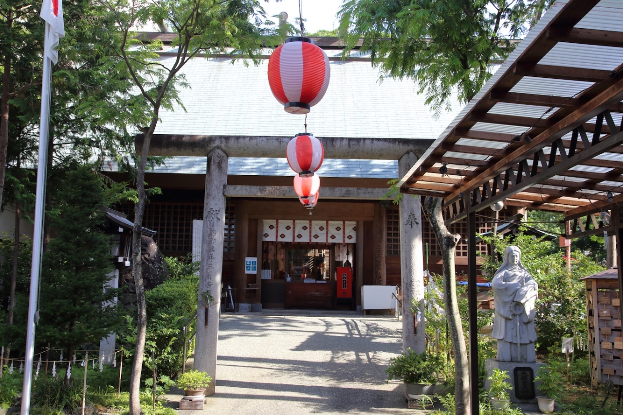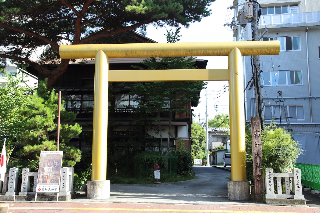 ひろめ市場や高知城の直ぐ近くにある神社です。帯屋町の商店街を高知城方面に通り抜け、ひろめ市場、島本病院を通り過ぎたところにあります。鳥居が金色に塗られているので、直ぐに気がつくと思います。