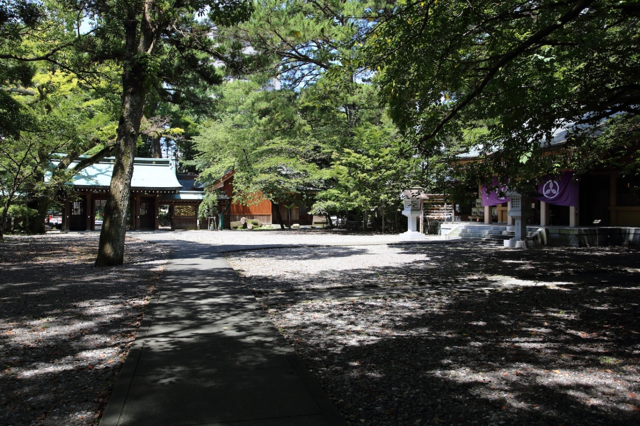 県民文化ホール、鷹匠公園の南に鏡側に沿って境内が広がっています。県庁前電停で降り、南にまっすぐ進んで鷹匠公園の池の脇にある階段を上ると、そちらに鳥居が立っています。なお、山内神社と鏡側を挟んだ河川敷が有料駐車場になっているので、車の場合はそちらに止めると良いでしょう。きちんと舗装されています。