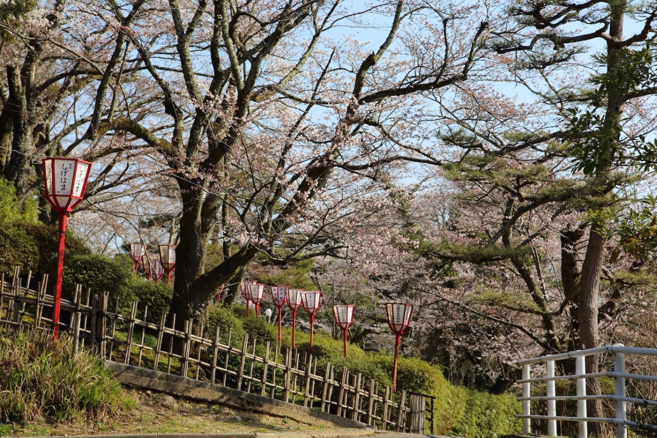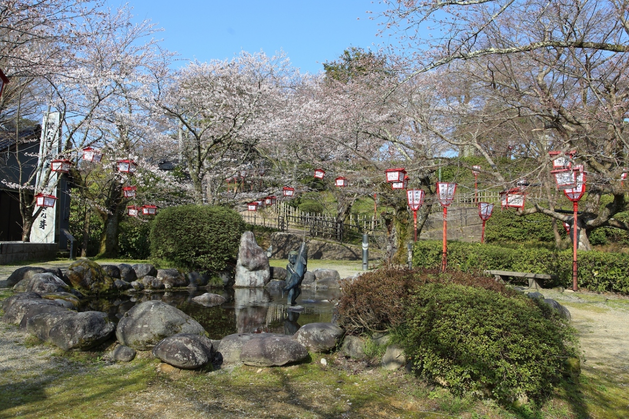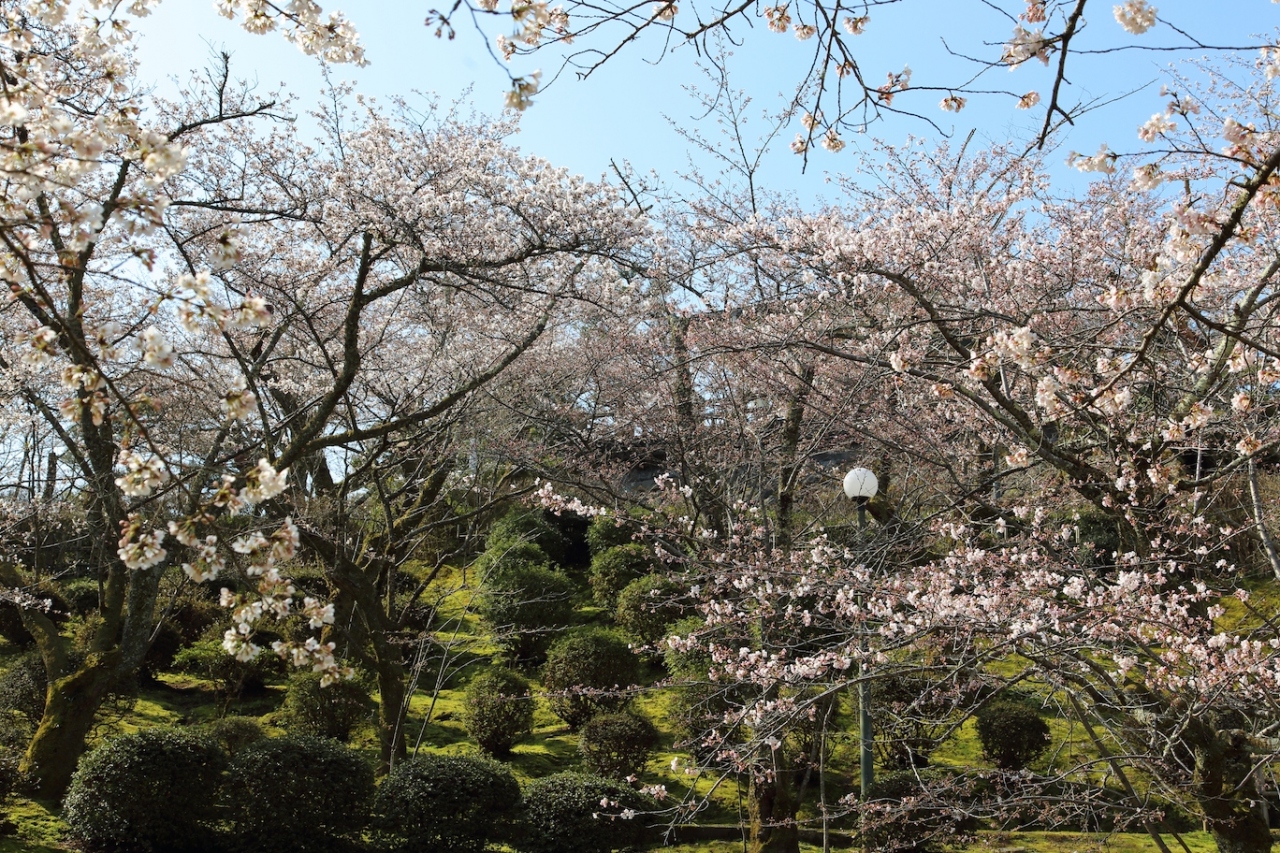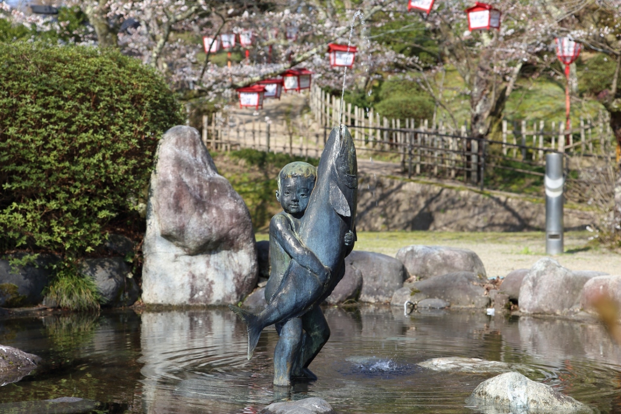 県内有数の桜の名所で、神武天皇の銅像が立つ中央広場を中心に桜が植えられています。広場にある展望休憩所から北側を見れば、一面に桜が咲き誇っている景色を眺められます。公園全体に遊歩道が整備されているので、広場から北側斜面に降りていけば、一面の桜の中を歩くことができます。私が訪問した際はまだ三分から五分咲き、というところでまだまだつぼみが目立つ状態でしたが、それでも十分に綺麗な景色を楽しめました。また、中央広場から東側に降りていけば噴水広場があり、ブリを抱えたブリ小僧の銅像が出迎えてくれます。桜をバックにしたブリ小僧と一緒に記念写真を撮るのも良いと思います。
