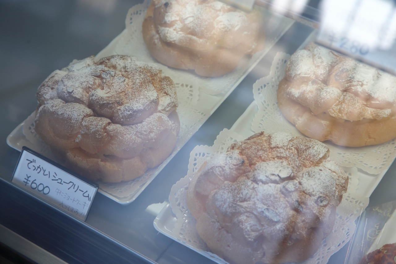 でっかいシュークリームが名物で、お店のホームページからも購入できます。中にはクリーム以外にスポンジと苺が入っており、シュー皮に苺ショートが包まれている、と言っても良いかもしれません。かなり大きいので、4等分くらいにすると良いと思います。私も頂きましたが普通に美味しかったです。