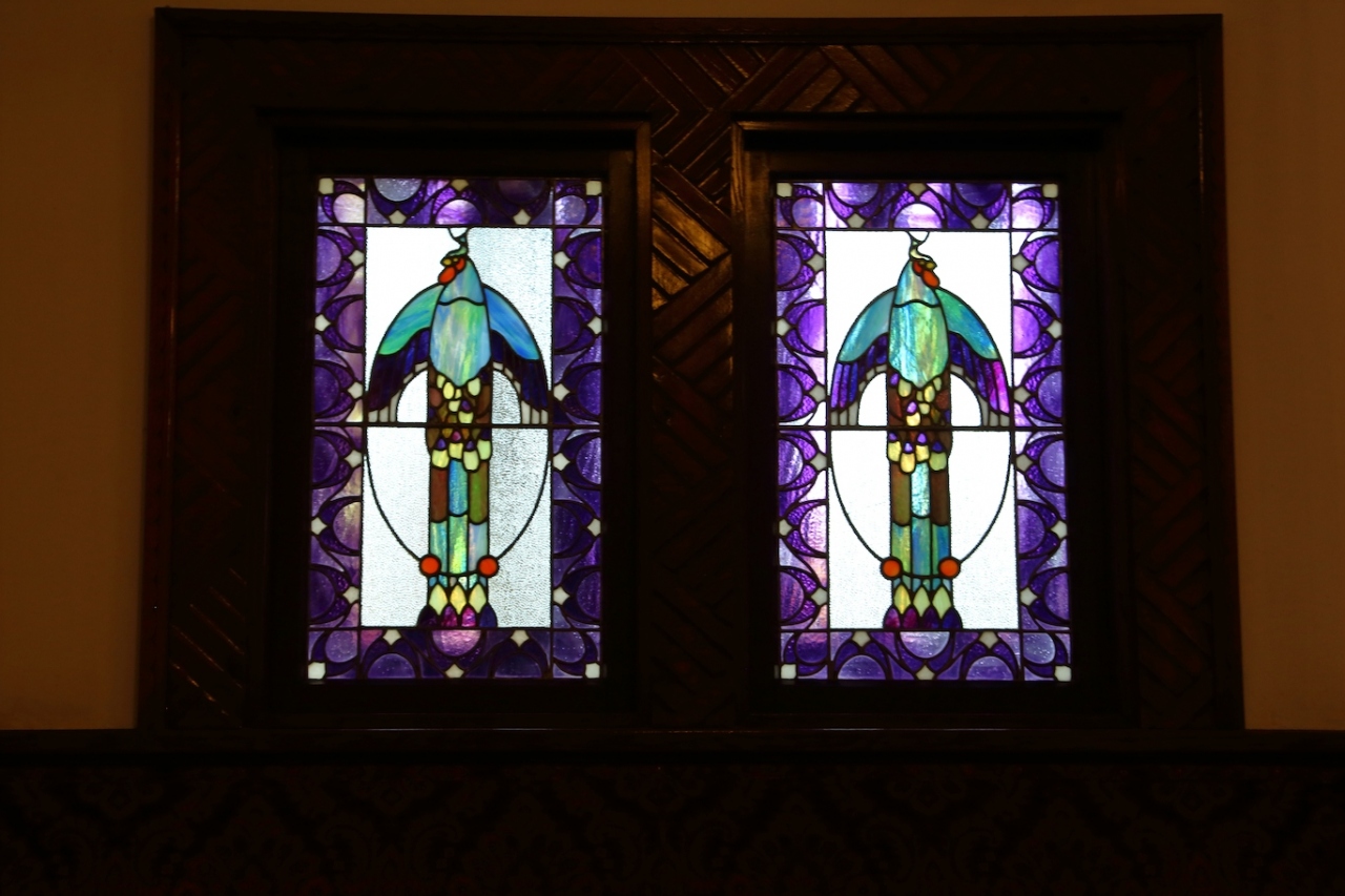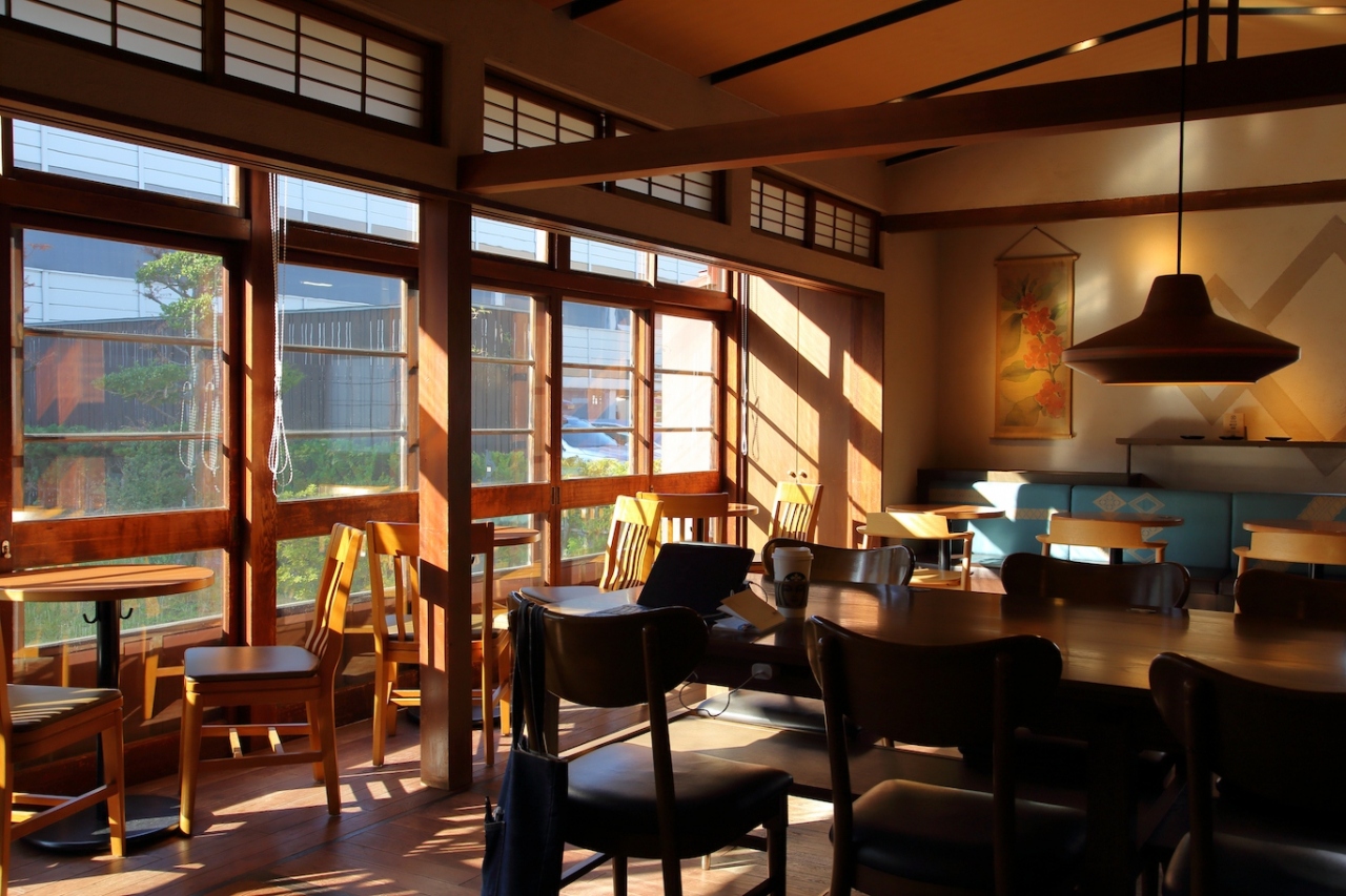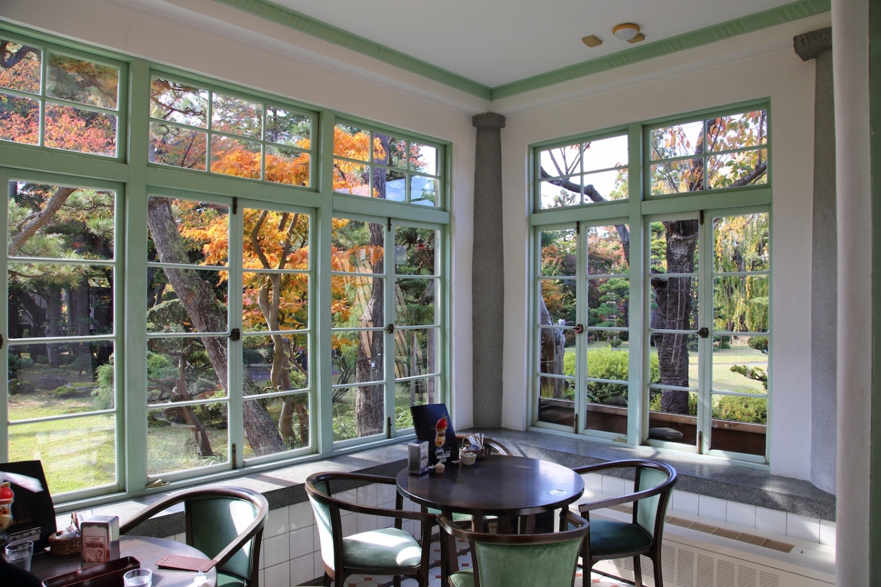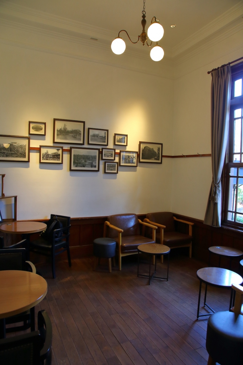内部は往時の雰囲気を損ねないよう、うまくリフォームされています。元々和室だったり、控室だったりしたところをリフォームしてテーブルと椅子を置いていますが、大正モダンな建物と現代の家具が喧嘩することなくうまく調和しています。実際、どの部屋も雰囲気が良く、何処に座ろうか迷いました。結局元和室だった席に座りましたが。