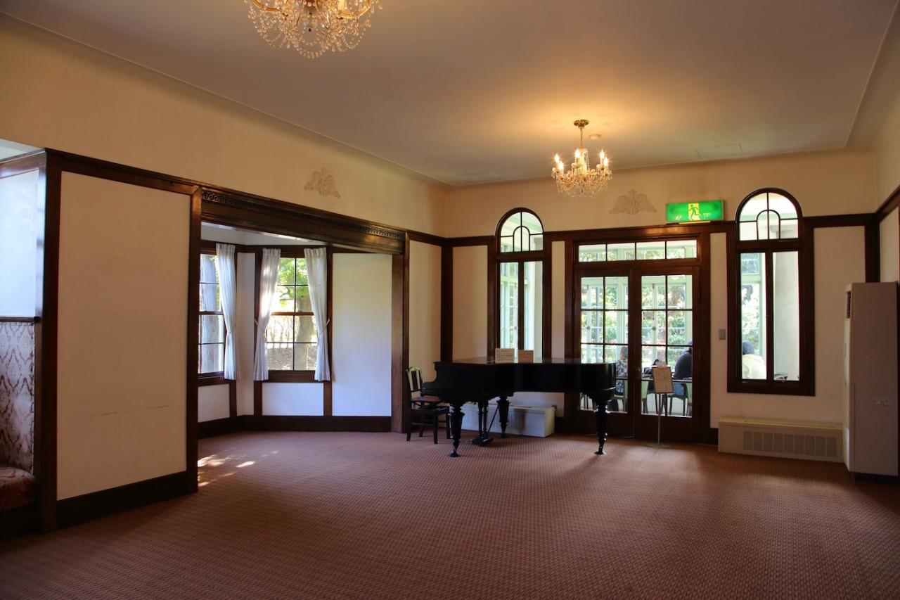 藤田記念庭園の洋館で営業している喫茶室です。てっきり洋館全体が喫茶室なのかと思っていましたが、喫茶室として開放されているのは1室とテラスのみで、あとは普通に洋館として見学できます。庭園を造った藤田氏の資料が飾られている部屋や、ピアノの置いてあるホール、暖炉室などは立ち入り自由です。2階には会議室が置かれ、そちらも予約制で使用できるようです.