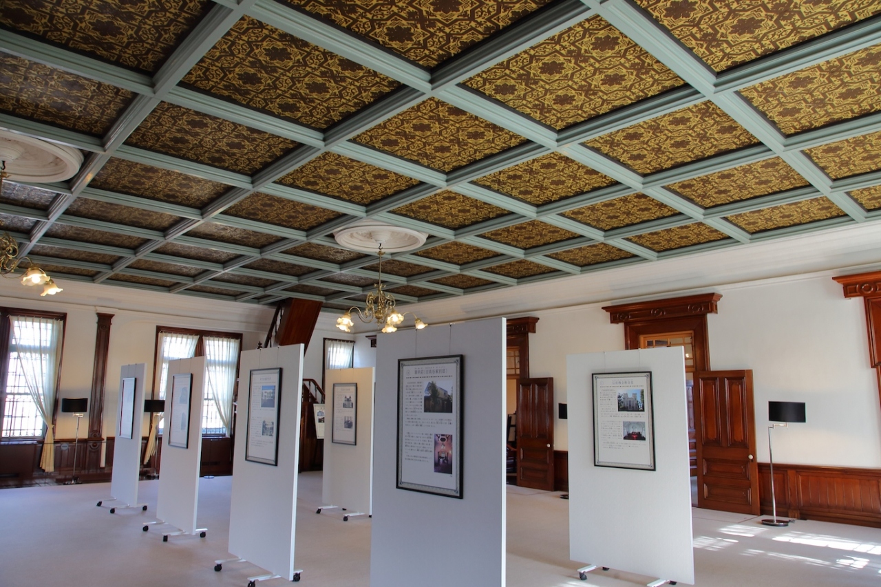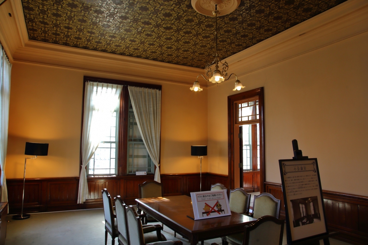 明治のルネサンス風建築で、国の重要文化財に指定されているだけあり、外見は華美で重厚、一見の価値がある洋館です。銀行という性格からか、内部の雰囲気も重厚でありながら重すぎず、軽すぎもせず、という絶妙のバランスを保っています。1階の営業室には立派な欅のカウンターも残っており、シャンデリアも現代の視点で見ればモダンで趣があります。2階の大会議室は天井の装飾に金唐革紙が使われており、1階に比べれば華美ではありますが必要以上ではなく、却って歴史を感じさせます。まだまだ十分に銀行として営業できるのでは無いかな、と思いました。
