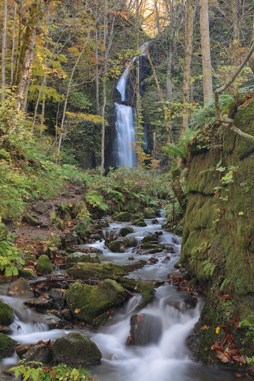 102号線沿いから見ると、滝壺から渓流までの流れも含めて荒々しいですが、それが非常に絵になります。あまり紅葉は進んでいませんでしたが、十分に美しい景色でした。こちらは滝壺に近付けるので、滝を間近で見ることができます。遠目で見るだけでも綺麗な滝ですが、近付くとより迫力と美しさを感じられます。足下が濡れているので注意が必要ですが、訪問の際には是非近くまで寄ってご覧ください。