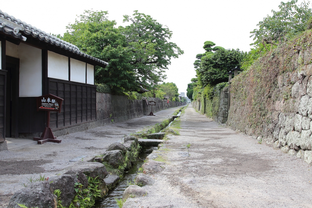 島原市街にある武家屋敷街です。江戸時代初期に築かれた町で、丁度島原城の西側に位置しています。島原駅からは大体1km程度なので、散歩がてら行くには丁度良い距離でしょう。駅を降りて真正面の島原城に歩いていき、濠沿いに北(右手)側に回り込んで西へ向かってください。島原商業と時鐘楼のある路地を西に進むとT字路に出ますが、1本裏側が武家屋敷街です。