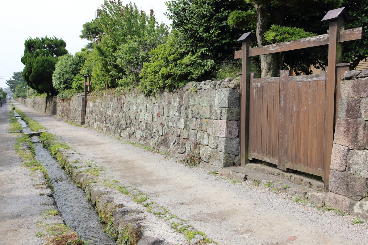 砂利道の中央に水路が整備され、両脇に石垣や板塀、冠木門が並び、往時の雰囲気を残しています。単純に散策するだけでも楽しい場所です。江戸時代から明治初年の間に建築された武家屋敷も3件公開されていて、全て無料で見学できます。売店もあり、そちらで一休みすることも可能です。なお、売店の敷地にある水神祠は江戸初期の建立です。