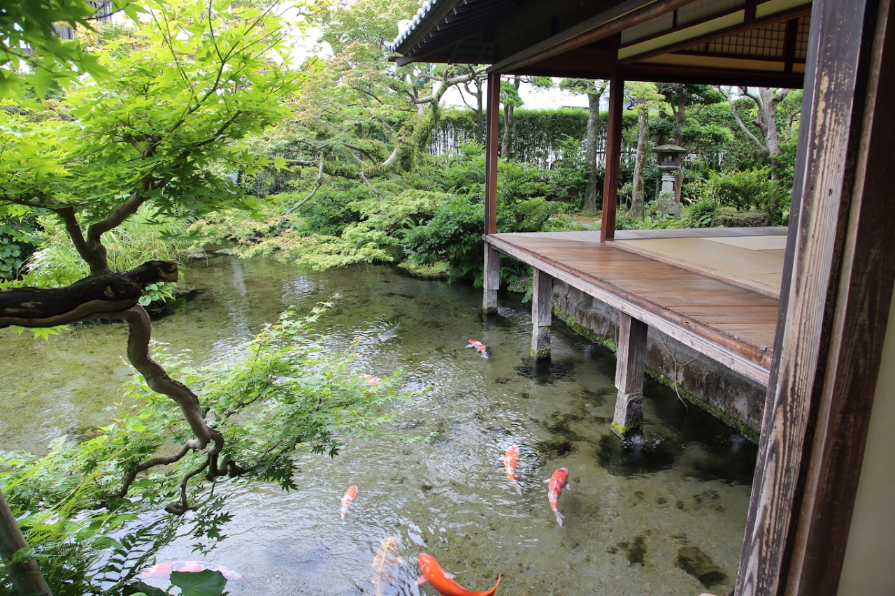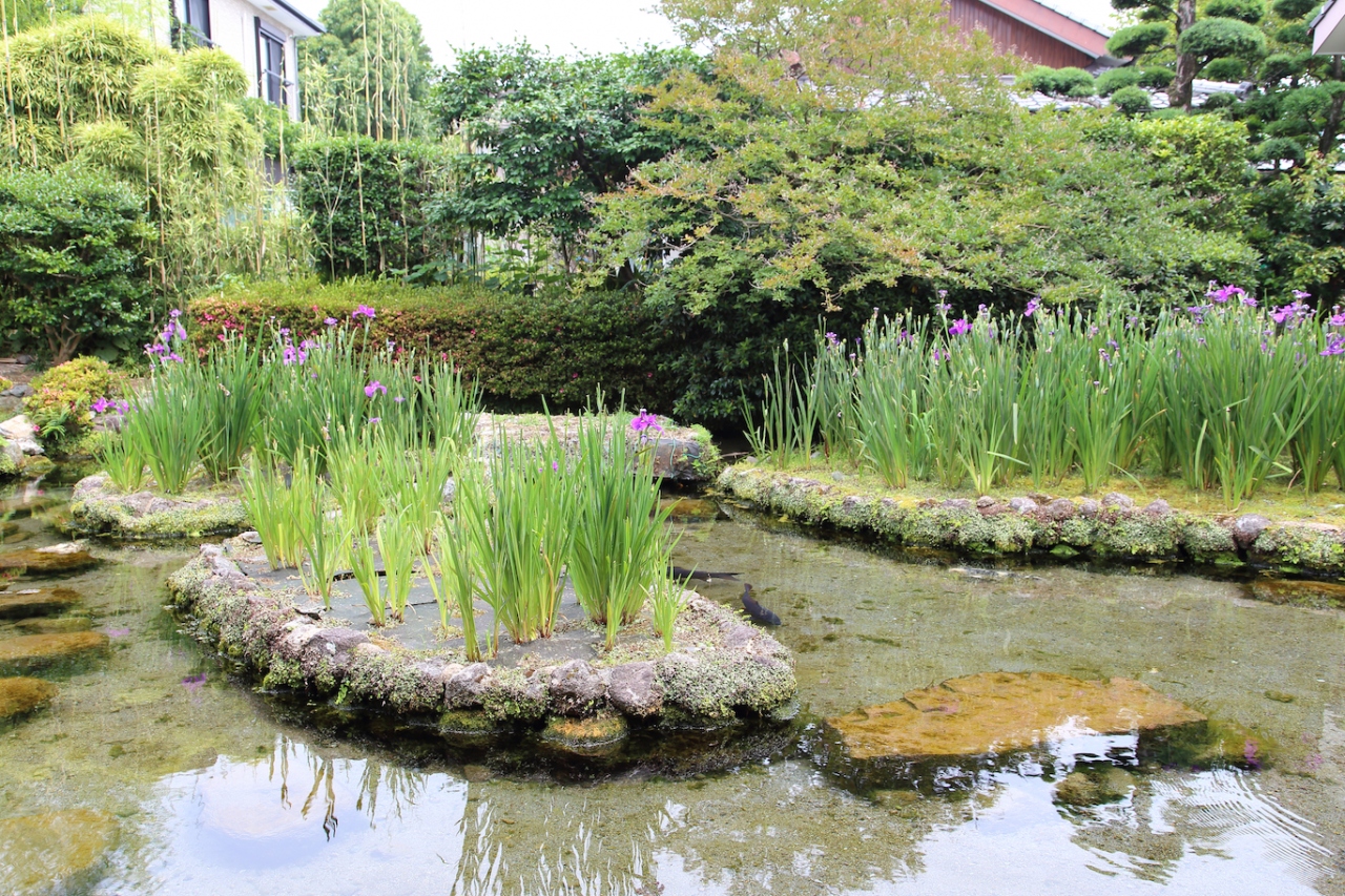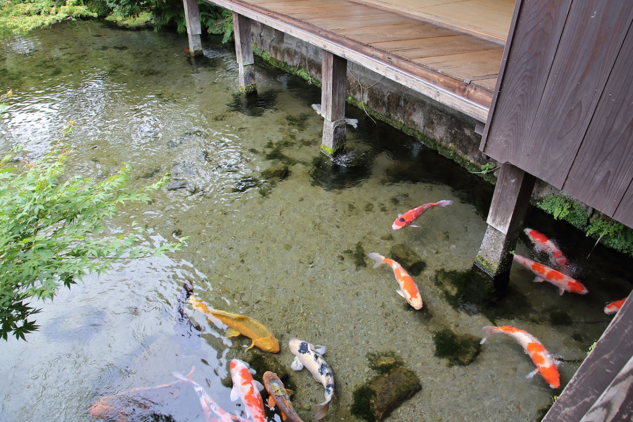 こちらの特徴は家の前に湧水を使った池が広がっていることです。そこに沢山の色とりどりの鯉が泳いでおり、落ち着いた風情のある家と相まって、何とも言えない美しさを醸し出しています。歴史を重ねた家屋と庭園の緑、透明な湧水と赤や金の鯉が一体となり、これぞ日本の美、というものを見ることが出来ます。家の中にも入ることが出来、座敷から池と庭を眺めていると物凄く落ち着きます。1日中でも居たいような気分になります。また、裏庭にも池が作られていて、そちらにも鯉が泳ぎ、水仙が植えられています。水仙の時期には見事な景色が見られるのでしょうね。
