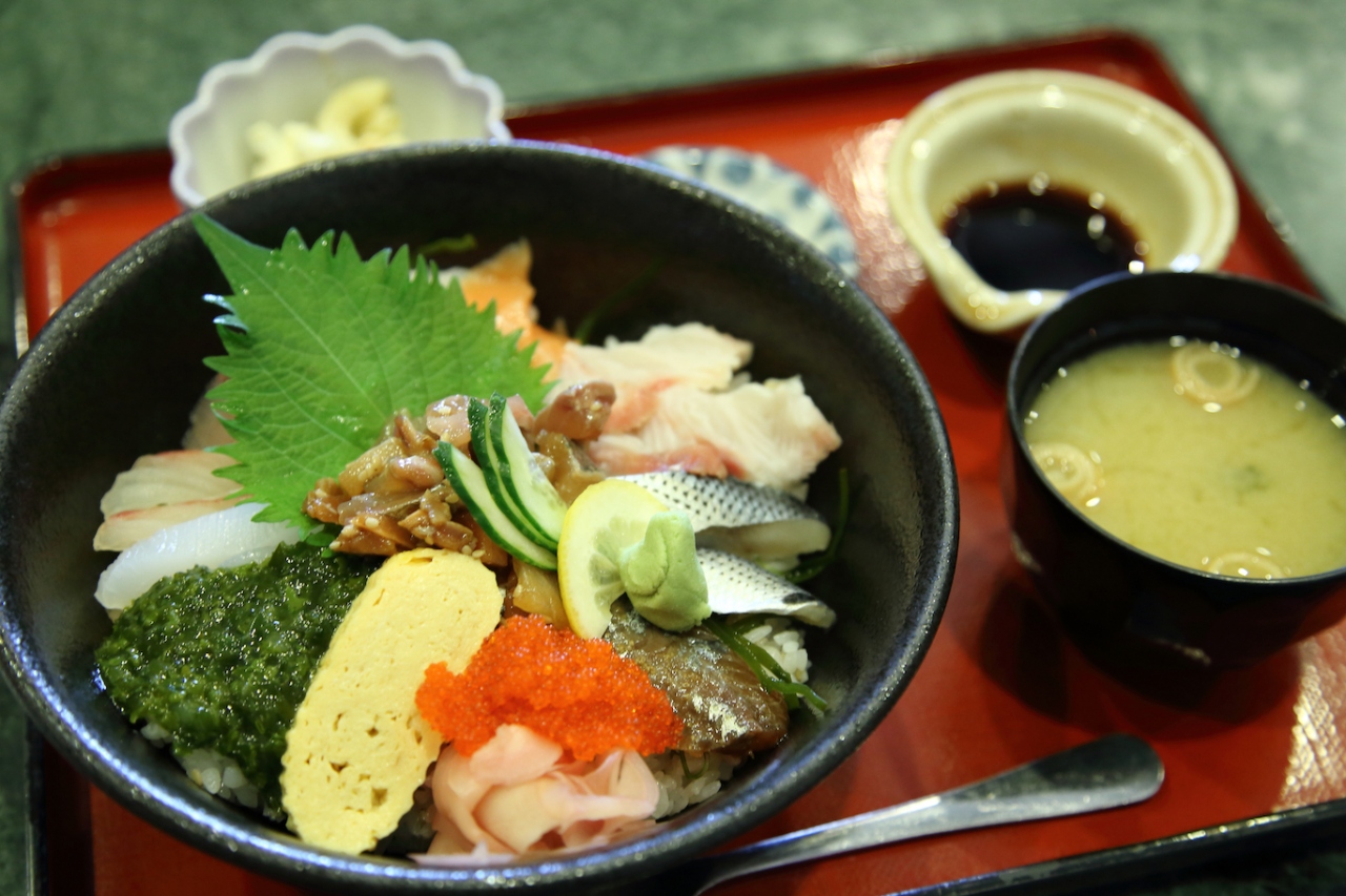 刺身と天ぷらが食べたかったので、海鮮丼と天ぷらを単品で頼みました。両方ともかなりのボリュームで、やっとのことで食べきりました。私自身は食が太い方だと思っていますが、平らげるのが大変でした。他のテーブルに運ばれていた料理もかなりのボリュームでしたので、欲張って頼まない方が良いでしょう。味は飛び抜けて良い、という訳ではありませんが、十分に美味しかったです。なお、別の建物に生簀があり、頼めば捌いてくれるようでした。地方発送もしていましたよ。- 旅行時期