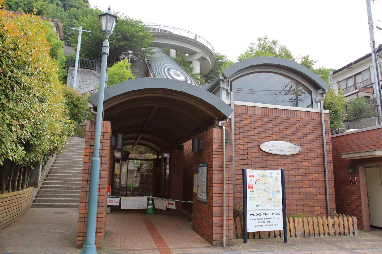 長崎市内に設置されている斜行エレベーターで、平地部分とグラバー園までを結んでいます。実際には、斜行エレベーターと垂直エレベータの組み合わせになっています。石橋の電停を降り、少し行ったところにある肉屋さんの角を曲がり、道なりに進むと乗り場が見えてきます。
