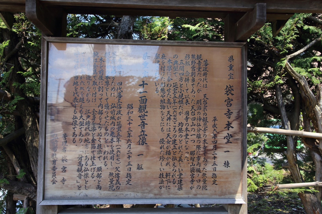 弘前市内にある小さなお寺です。蕪木門を抜けるとお堂があるだけの小さなお寺ですが、東北屈指の巨大な観音立像が安置されています。拝観は自由で、本堂内部にも自由に入ることが出来ます。中に入ると真正面に十一面観音立像があり、お堂内部が観音像の存在感で満ちているような雰囲気です。実際、その巨大さと、内部の薄暗さが相まって圧倒されるような雰囲気を感じます。また、天井には天女の絵が描かれていて、結構な由緒があることを感じさせます。実際、元は熊野神社の別当寺だったらしく、明治の神仏分離により報恩寺の観音堂と合祀され、現在の袋宮寺となったようです。報恩寺観音堂も江戸初期の建立らしいので、由緒があって当然ですね。