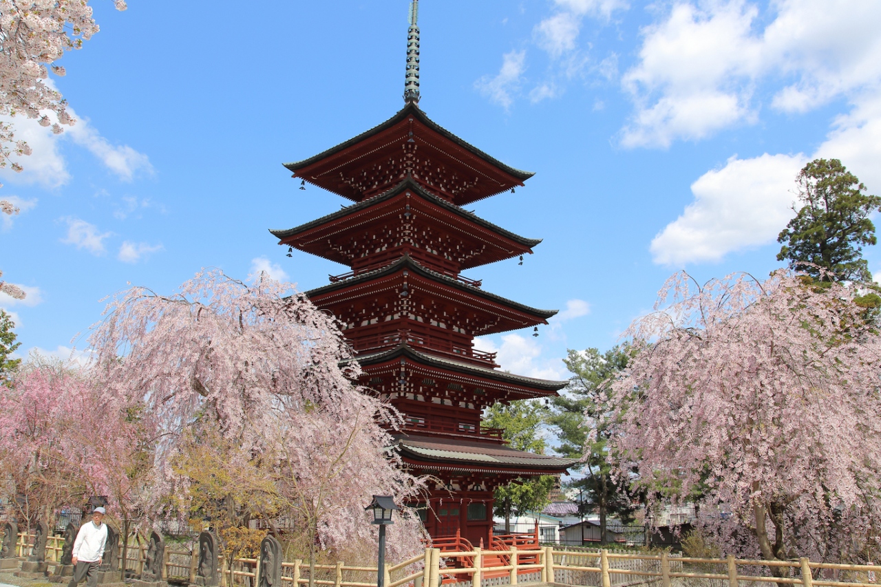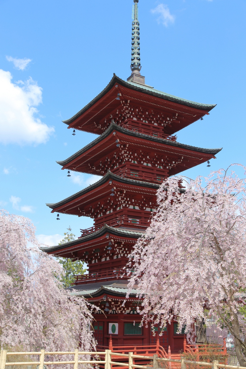 こちらの五重塔は東北一の美塔と謳われる通り、美しいシルエットをしています。桜の時期に訪問したので、桜と青空が赤い五重塔と美しいコントラストを作り出していました。長勝寺のように沢山の見所があるわけではありませんが、この五重塔は一見の価値があります。弘前に訪れた際は是非どうぞ。- 旅行時期