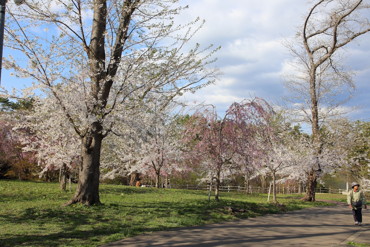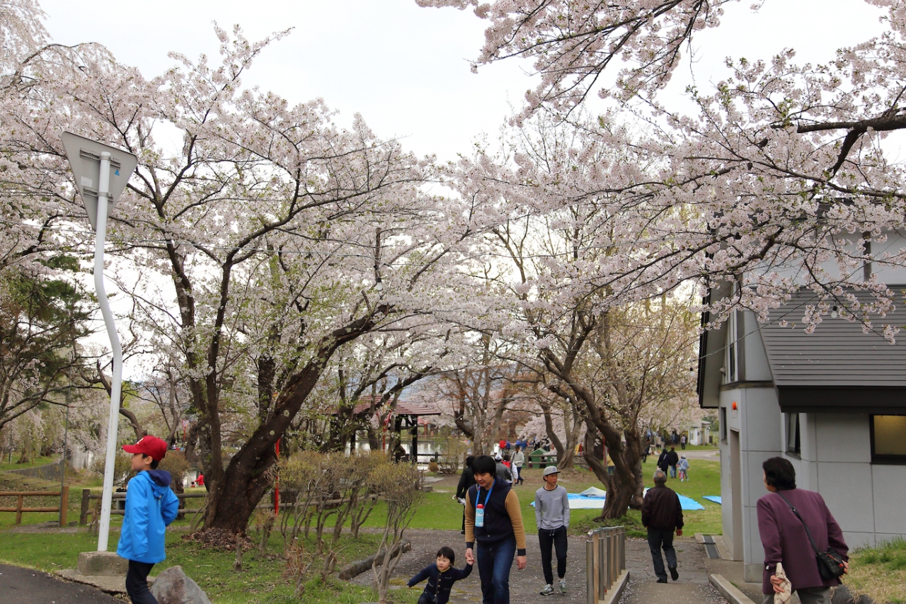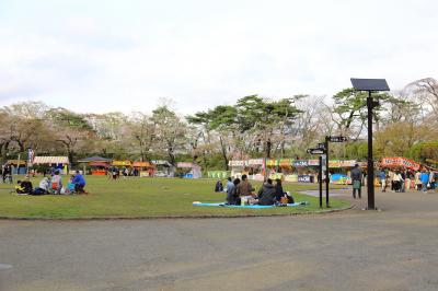 真人公園で桜が植えられているのは苑池周辺と、その池の上側の広場周辺です。さくらまつりのメイン会場のその辺りにあります。私が行った日(4/29)は生憎の曇り空でしたが、桜は満開で見応えがありました。駐車場も満杯でしたね。