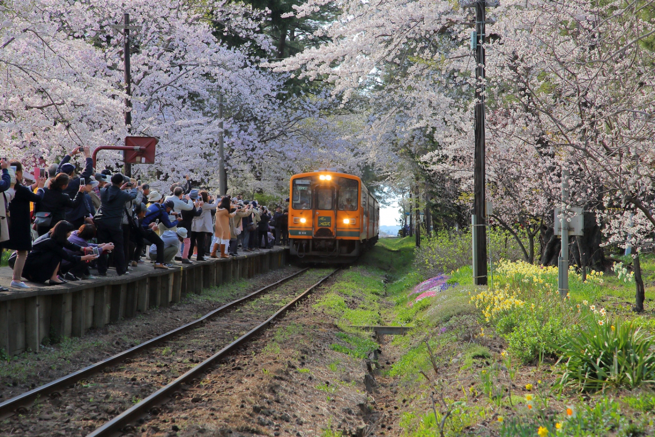 単純に桜を見に来るだけでも楽しい場所ですが、この公園で見るべきは桜のトンネルの中を進む津軽鉄道の列車です。線路の両側に桜が植えられているので、満開の時期にはまさに桜のトンネルを列車が潜っているように見えます。この光景を目当てに大量の観光客が押し寄せており、シーズンには小さなホームが満杯になります。個人的にお勧めの撮影場所は駅南側の踏み切り付近で、芦野公園を発着する列車と桜を綺麗にカメラに収められます。鉄道ファンの方もそうでない方も、津軽の名所として必見の場所です。- 旅行時期