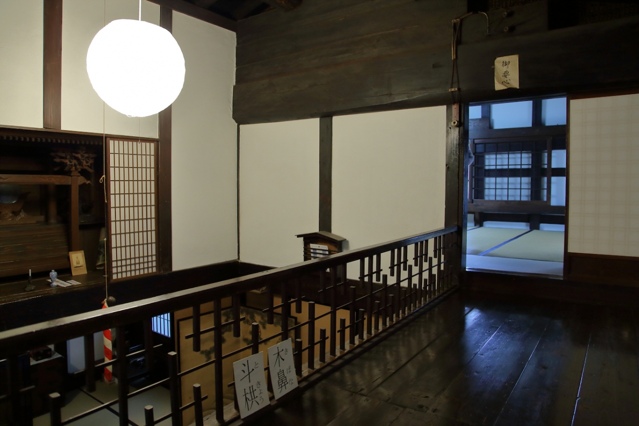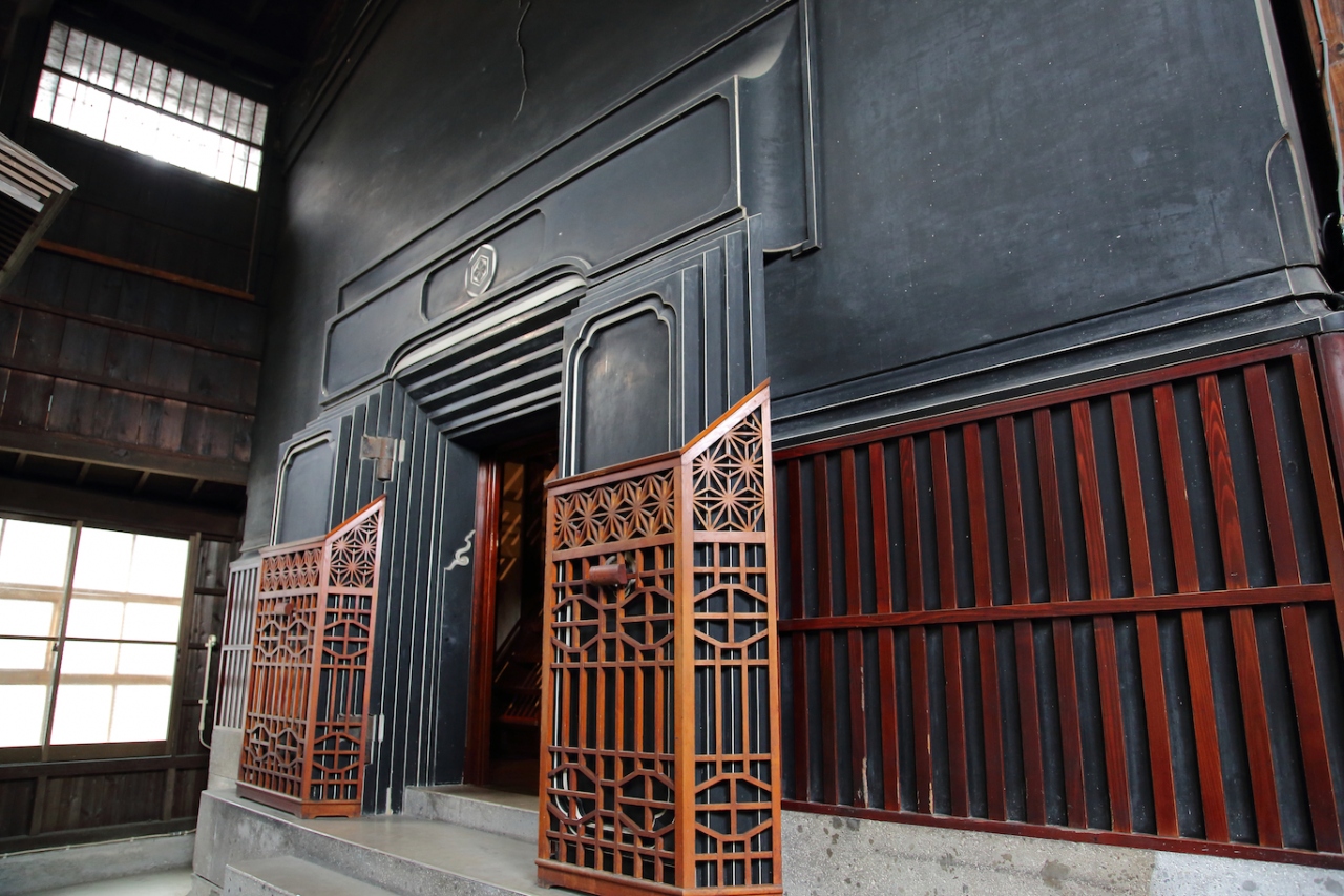 外見上は他の家屋とあまり変わりませんが、生活空間である主屋部分が既に蔵になっており、奥に倉庫としての蔵が繋がっている、という構造をしています。その意味では、道路に面した店舗部分から既に内蔵になっているわけです。これは、2階ベランダ部分の壁が土蔵になっていることからも判ります。また、入口にも一般的な土蔵で使われる立派な扉が設えられています。他の家屋はこのような構造をしていないので、非常に珍しい構造です。内部に使われている柱や梁などは物凄く立派なもので、当時の佐藤家の財力の凄さが判ります。