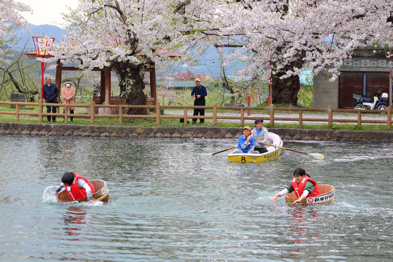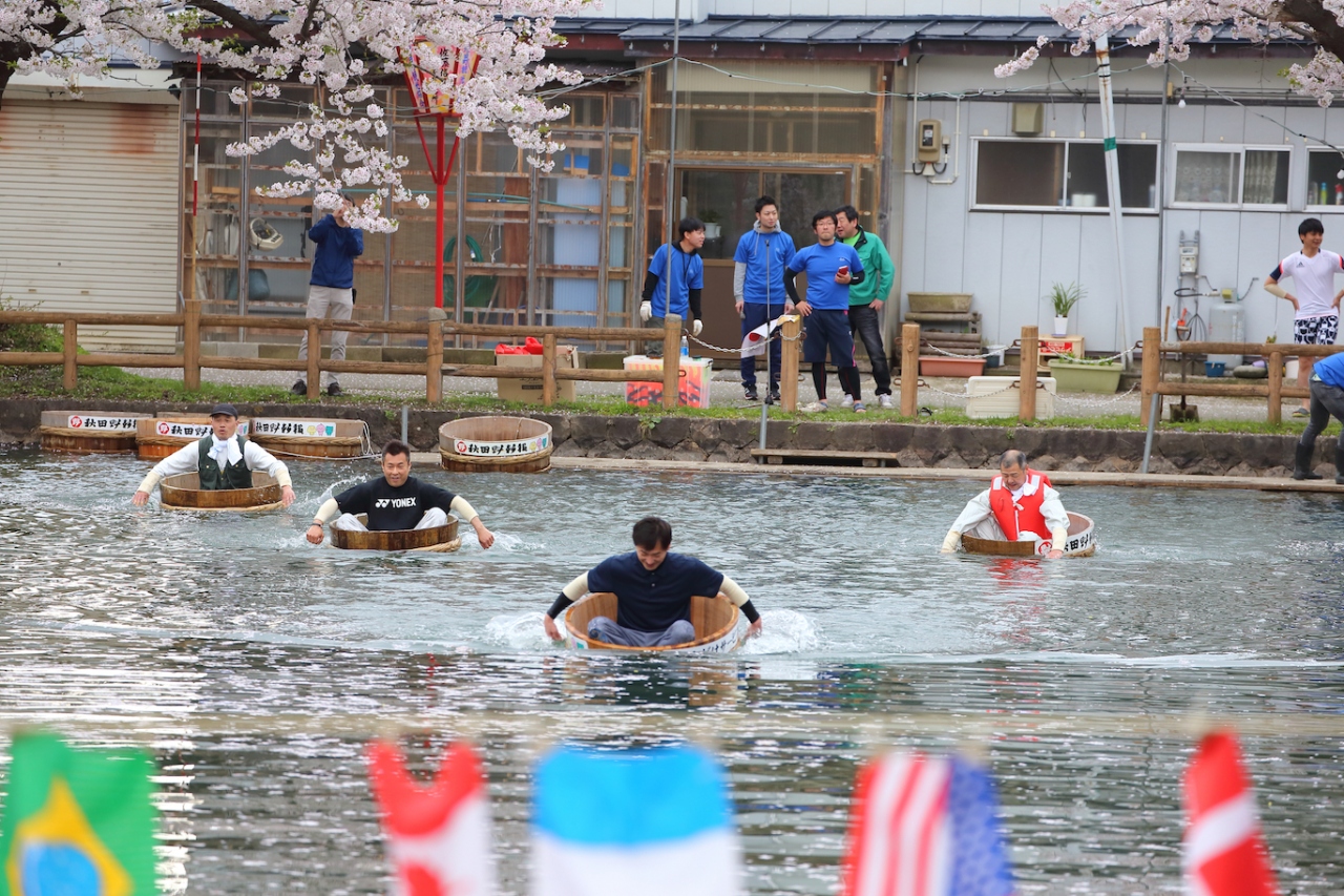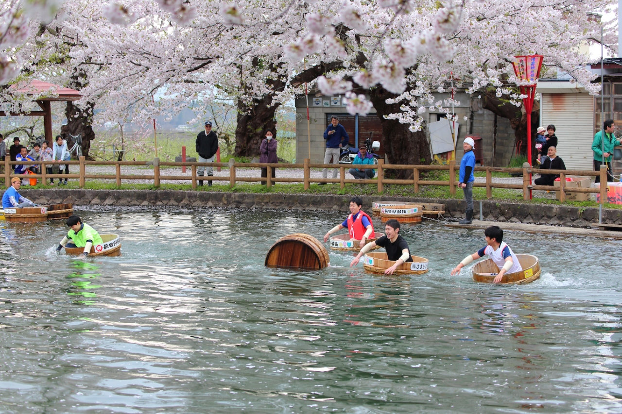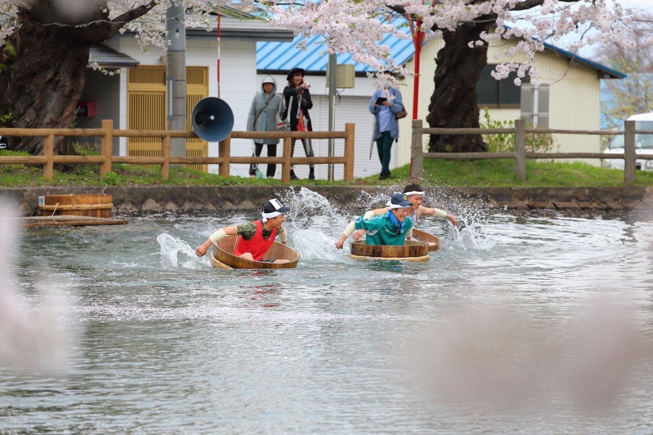 こちらのさくらまつりで一番のハイライトはたらいこぎ競争でしょう。映像で見たことがある方も多いと思いますが、池に浮かべた盥に座り、手で漕いで誰が一番早くゴールできるを競う競技です。1レースの参加者は4~5名で、レース数は参加者数に拠って変わりますが、私が訪問した際は5レース開催されていました。ギャラリーも多く、やっぱり知名度は高いようです。レース自体は静かなものからヒートアップするものまでありましたが、お約束の転覆などもあり、十分に楽しめました。毎年4/29の午前10:30くらいから開催されているそうなので、GWに増田に遊びに行かれるなら足を延ばしてみることをお勧めします。朝、増田の朝市をぶらついてから真人公園のさくらまつりを見て、午後は増田の内蔵を見学する、なんていうコースがお勧めです。- 旅行時期