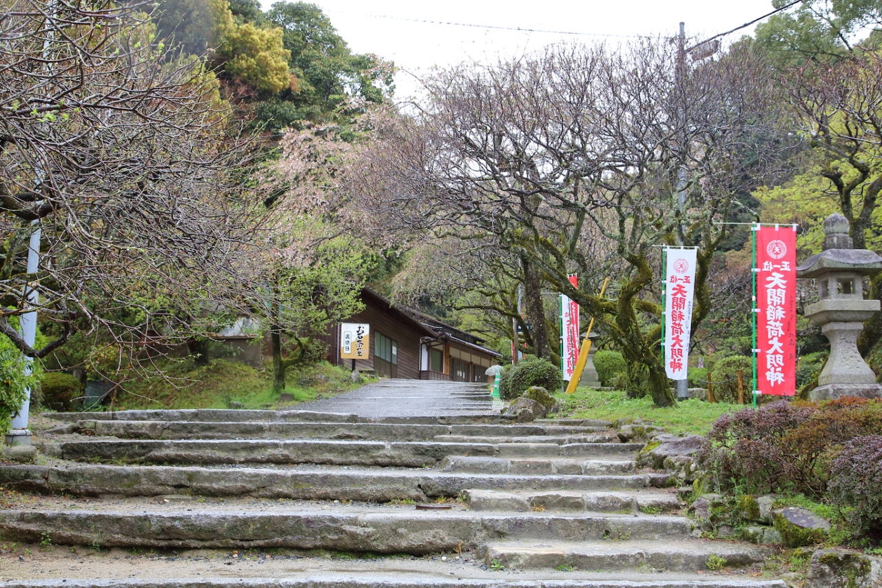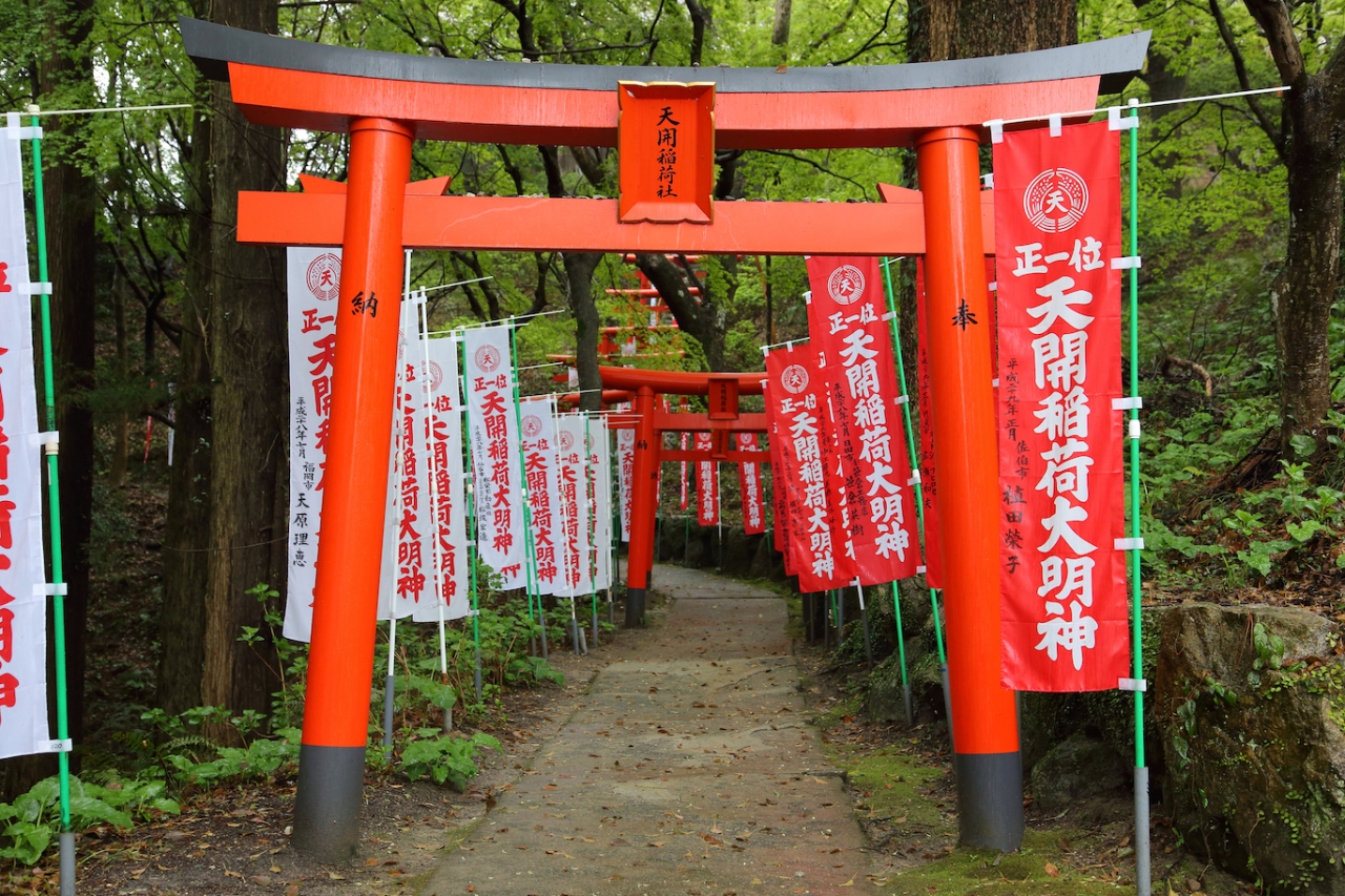 天満宮北側の梅園を抜けると、松島茶屋やお石茶屋に面して石段が整備されています。その石段を登っていくと広場があり、そちらから天開稲荷社の鳥居が続いています。鳥居に従って上っていくと、天開稲荷社の拝殿に着けます。なお、階段は狭く、結構急ですので気をつけてください。なお、途中にあるトンネルを抜けると県道578号に出られます。