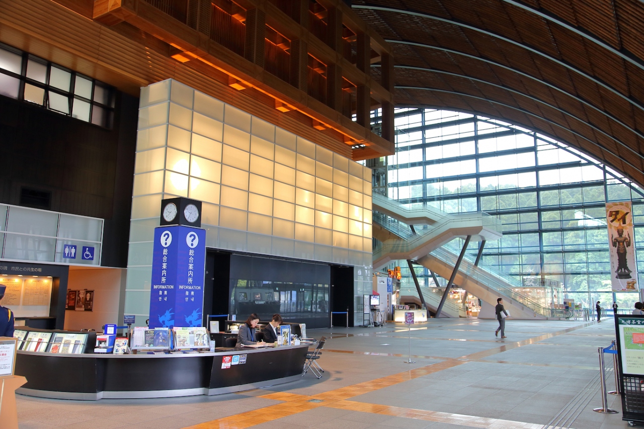 熊本市役所が観光地?、と思われるかも知れませんが、熊本市役所14階の廊下から熊本城を一望できるようになっています。意図的に作ったものか判りませんが、無料で公開されており、観光客が多く訪れています。なお、この廊下は大ホールを囲む形になっていますが、大ホールは熊本震災の被災者向けの罹災証明の受付・申請場所になっていました(2017年4月現在)。熊本城を一望できてテンションが上がりますが、場所を考え、はしゃいだりすることの無いようにすべきでしょう。行き方は簡単で、市電の市役所前で降りれば目の前です。