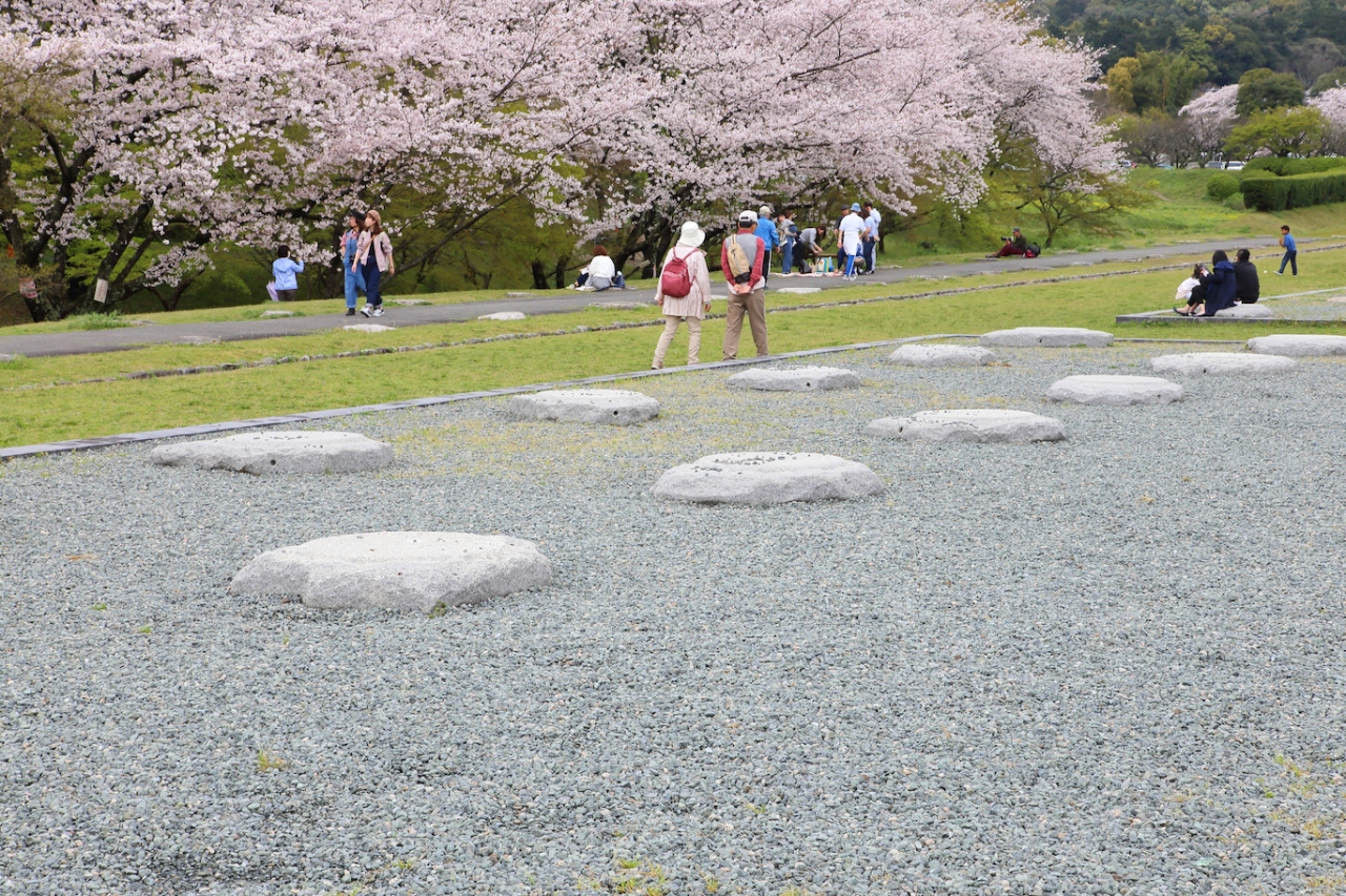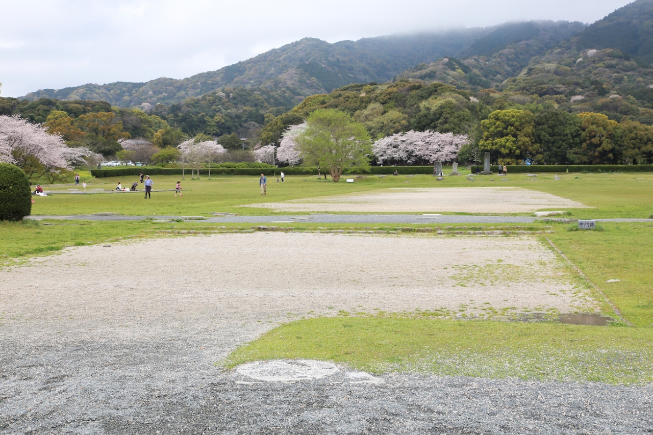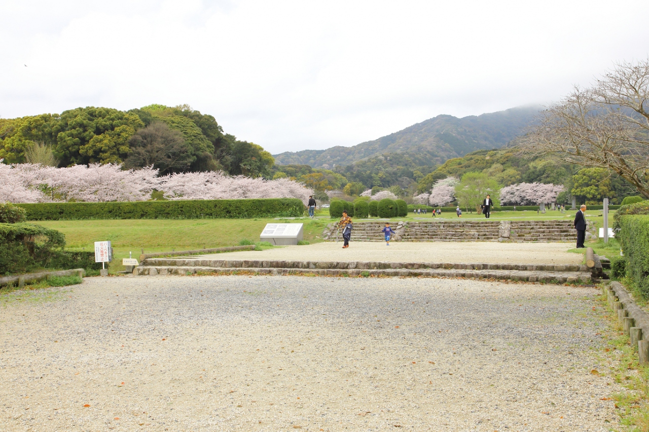 かつては九州を統括していた役所が立ち並んでいたのでしょうが、現在は立派な礎石を残すのみで、何もありません。一面芝生に覆われ、周囲には桜が植えられ、市民の憩いの場として親しまれているようです。私は桜の季節に訪問しましたが、桜が咲き誇り、周囲の山々の緑と相まって非常に風光明媚でした。長閑な雰囲気で、地元の方や近隣の方がお弁当を持ってお花見やピクニックに来ている、という感じでした。