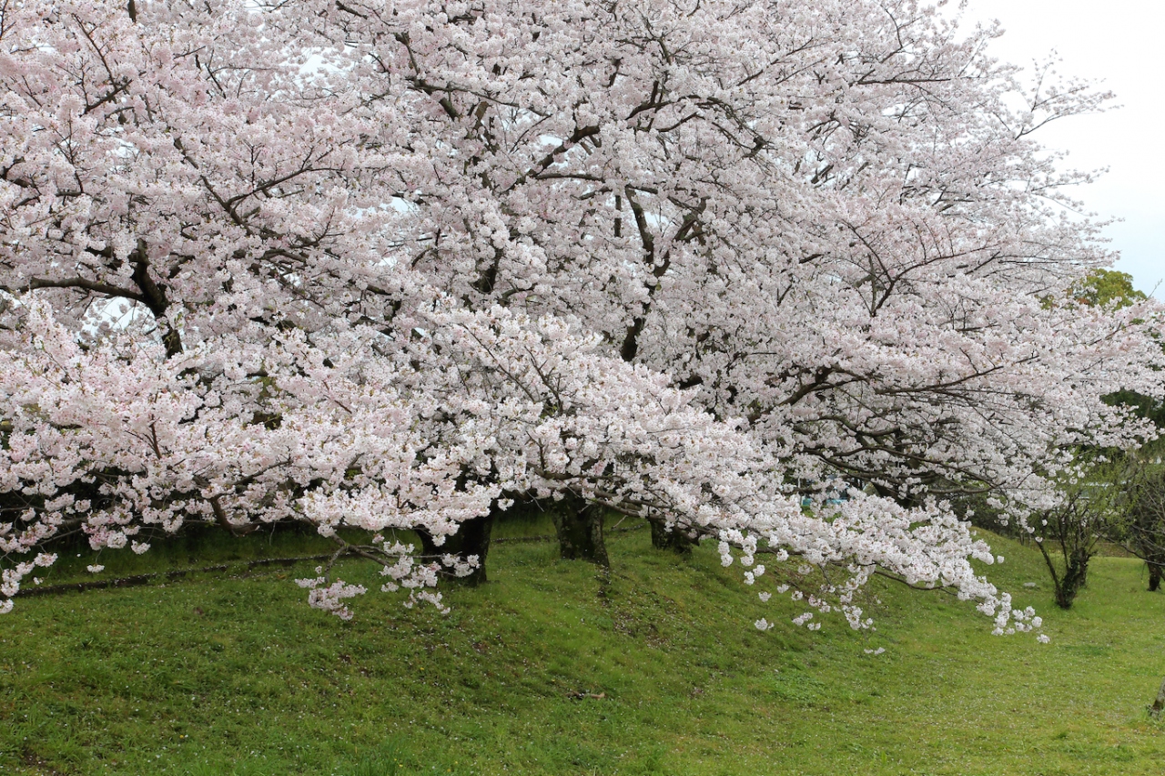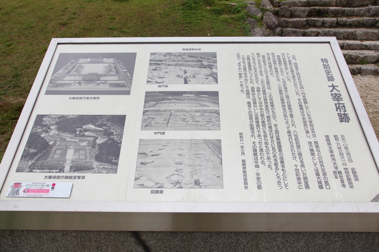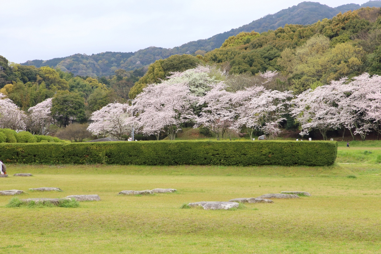 かつては九州を統括していた役所が立ち並んでいたのでしょうが、現在は立派な礎石を残すのみで、何もありません。一面芝生に覆われ、周囲には桜が植えられ、市民の憩いの場として親しまれているようです。私は桜の季節に訪問しましたが、桜が咲き誇り、周囲の山々の緑と相まって非常に風光明媚でした。長閑な雰囲気で、地元の方や近隣の方がお弁当を持ってお花見やピクニックに来ている、という感じでした。