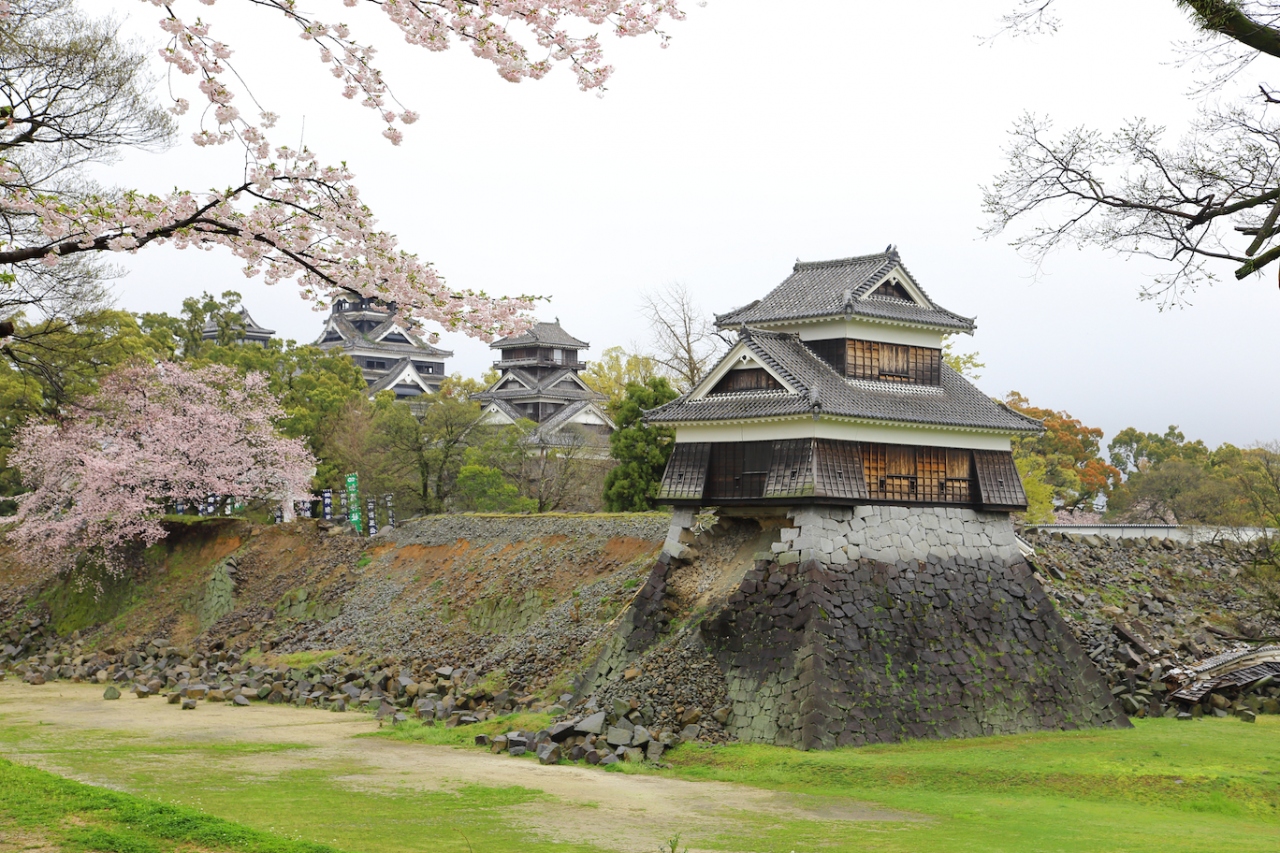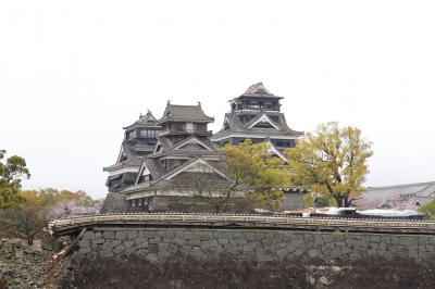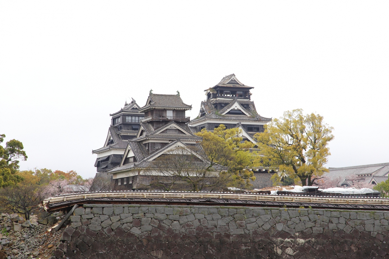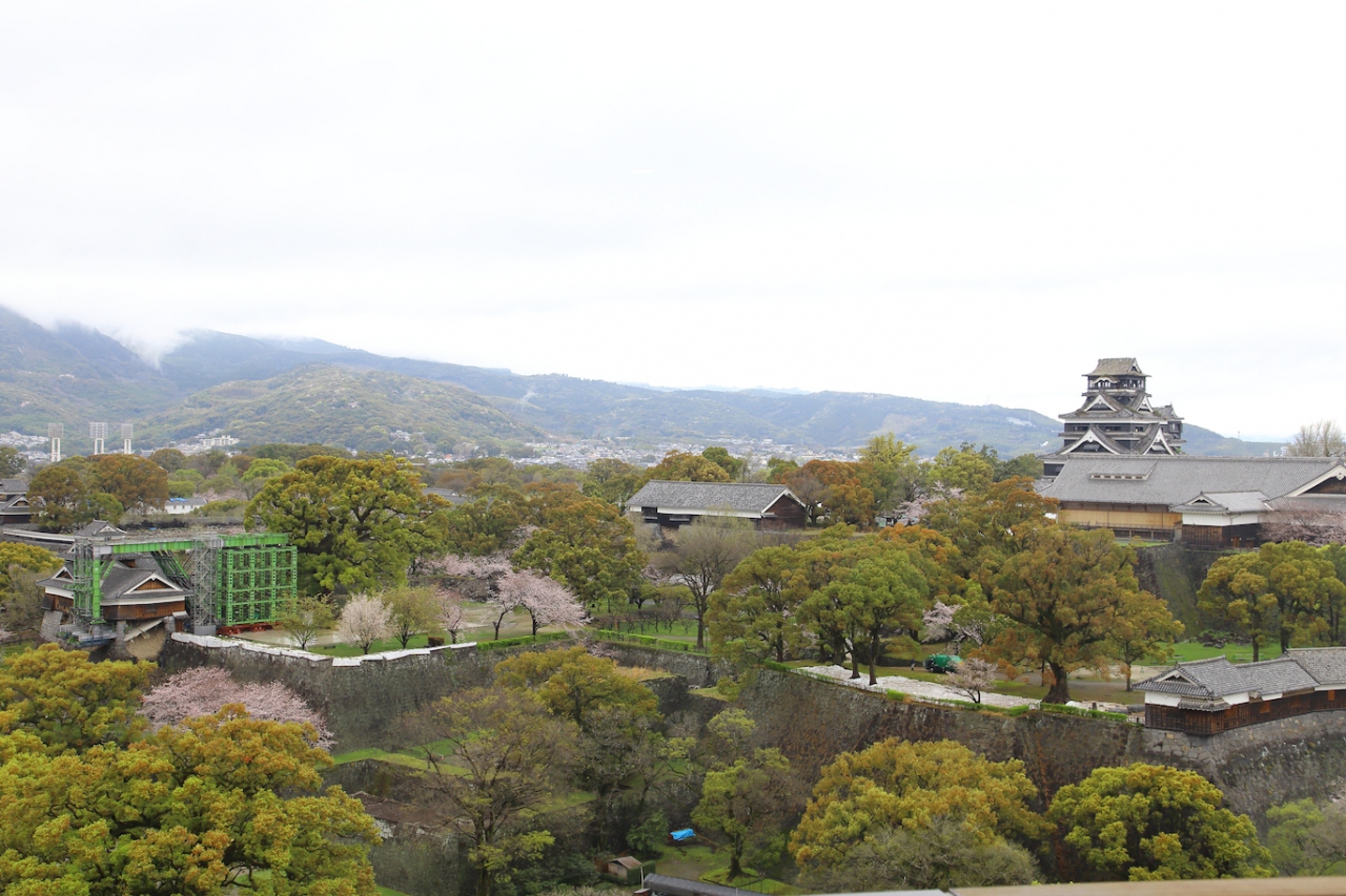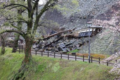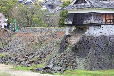 7年前に訪問したときは熊本城の威容に感動しましたが、現在は震災の影響で入場が禁止されています。駐車場や加藤神社には行けるのでそちらから見てみましたが、往時の威容は見る影もありません。石垣は無残に崩れ落ち、土塀は全て倒壊し、櫓の外壁は剥がれ、大天守は破壊され瓦と鯱が落ちて草が生えている、という状況で、見るに耐えない状態です。市街地にはそれほど地震の影響が残っているようには見えなかったので、大したことは無いのかな、と思っていましたが大間違いでした。桜の時期に行ったので桜は満開でしたが、余計に悲惨さを際立たせていました。なお、この惨状はGoogleストリートビューでも確認できます。