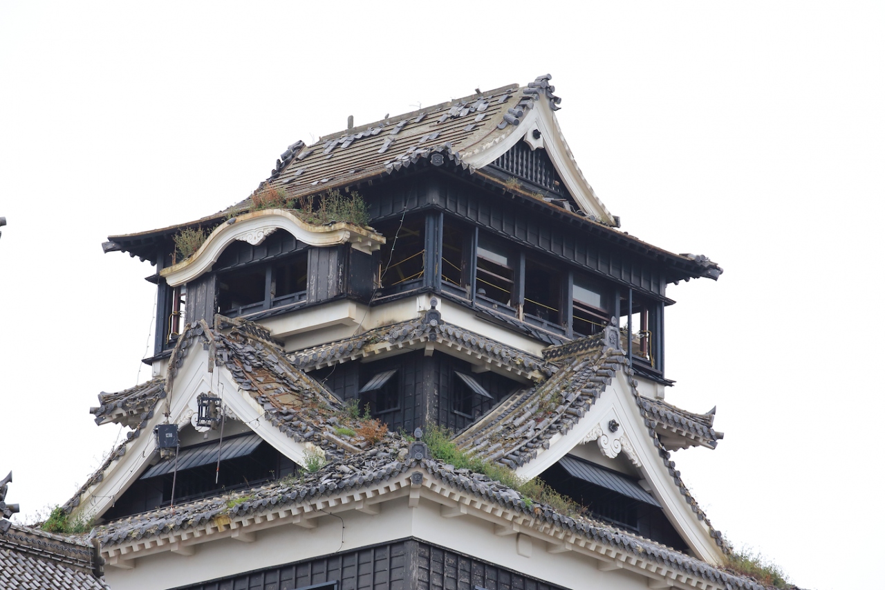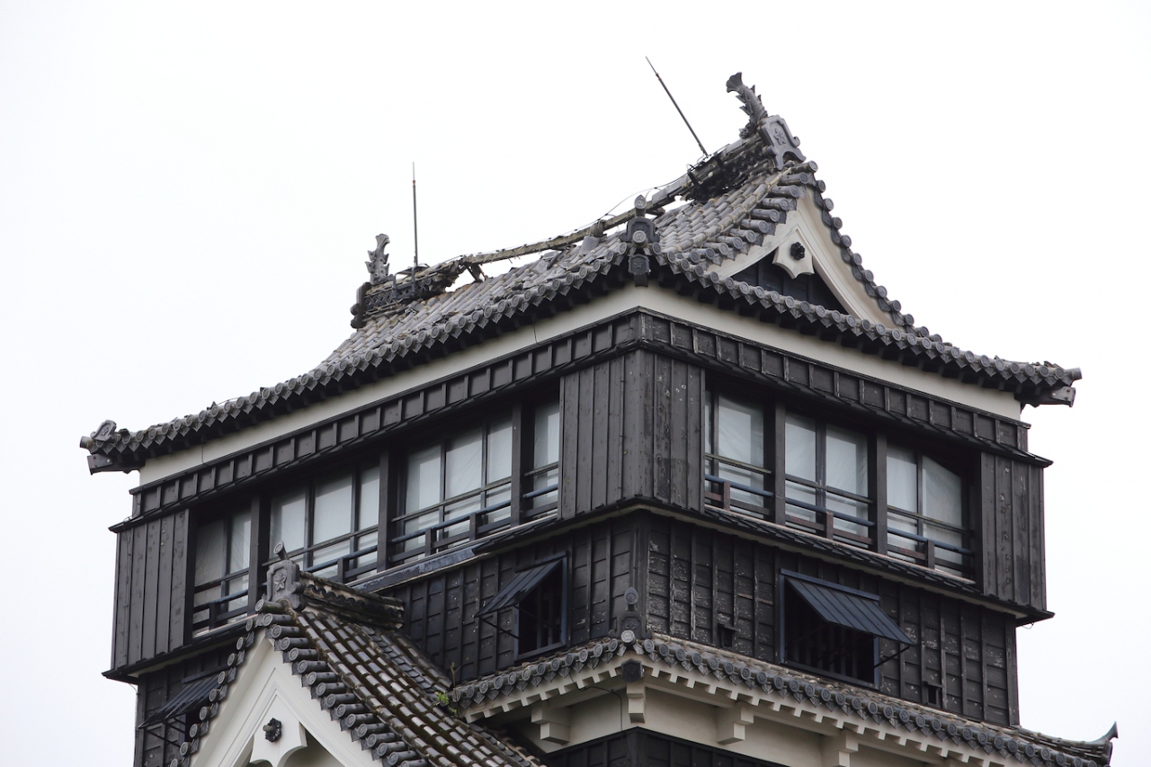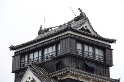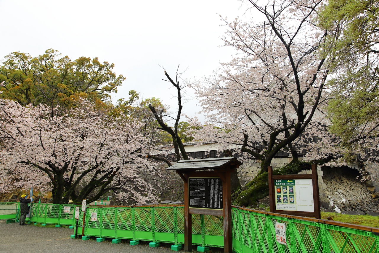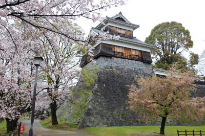 7年前に訪問したときは熊本城の威容に感動しましたが、現在は震災の影響で入場が禁止されています。駐車場や加藤神社には行けるのでそちらから見てみましたが、往時の威容は見る影もありません。石垣は無残に崩れ落ち、土塀は全て倒壊し、櫓の外壁は剥がれ、大天守は破壊され瓦と鯱が落ちて草が生えている、という状況で、見るに耐えない状態です。市街地にはそれほど地震の影響が残っているようには見えなかったので、大したことは無いのかな、と思っていましたが大間違いでした。桜の時期に行ったので桜は満開でしたが、余計に悲惨さを際立たせていました。なお、この惨状はGoogleストリートビューでも確認できます。
