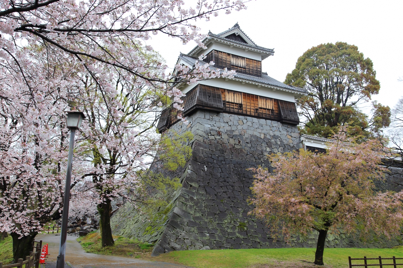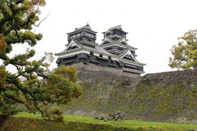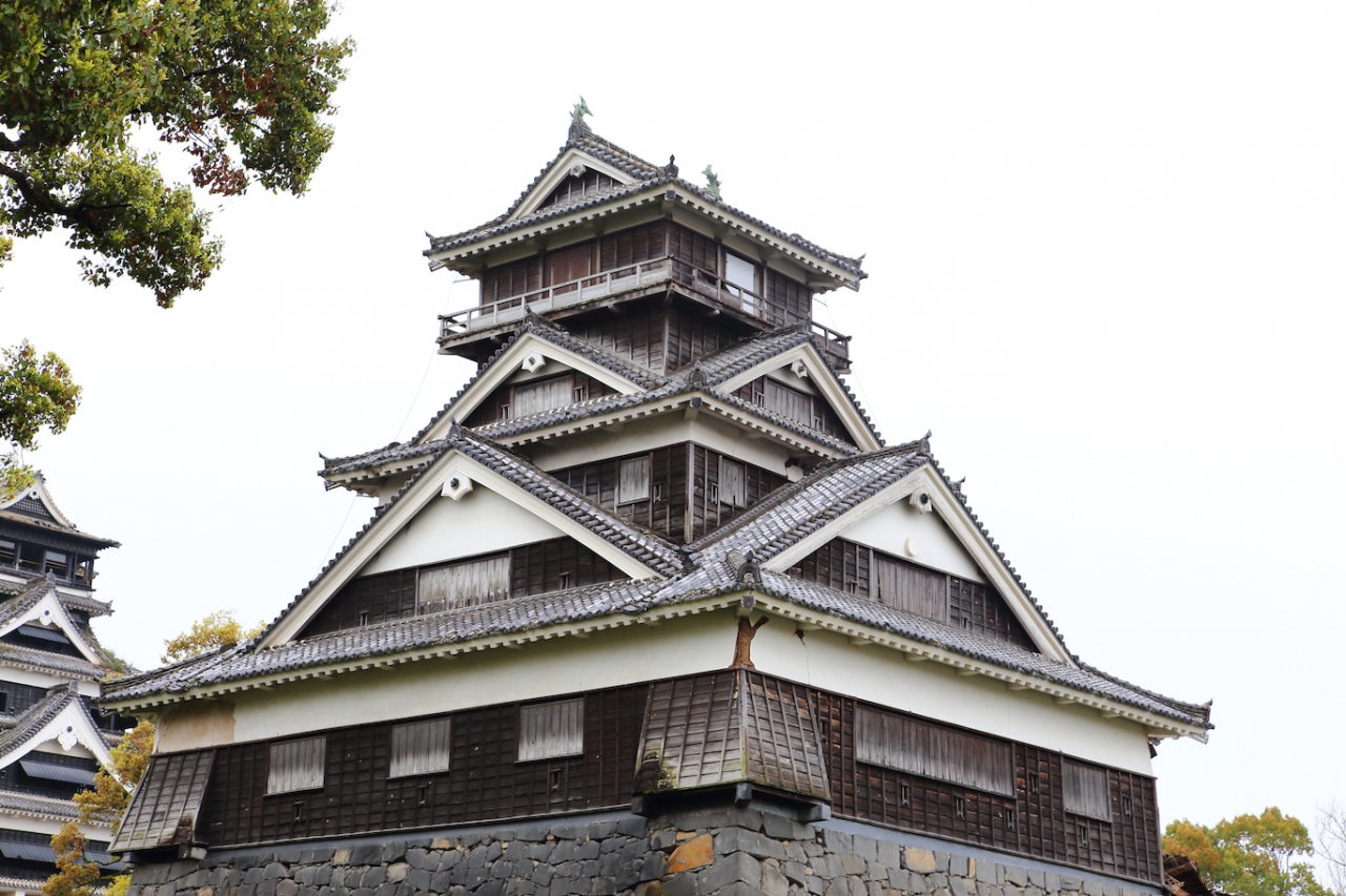 天下の名城として有名な、熊本のランドマークです。市電の花畑町が最寄になります。花畑町で降りて西に向かっていくと、加藤清正公の銅像の向こう側に見えてきます。