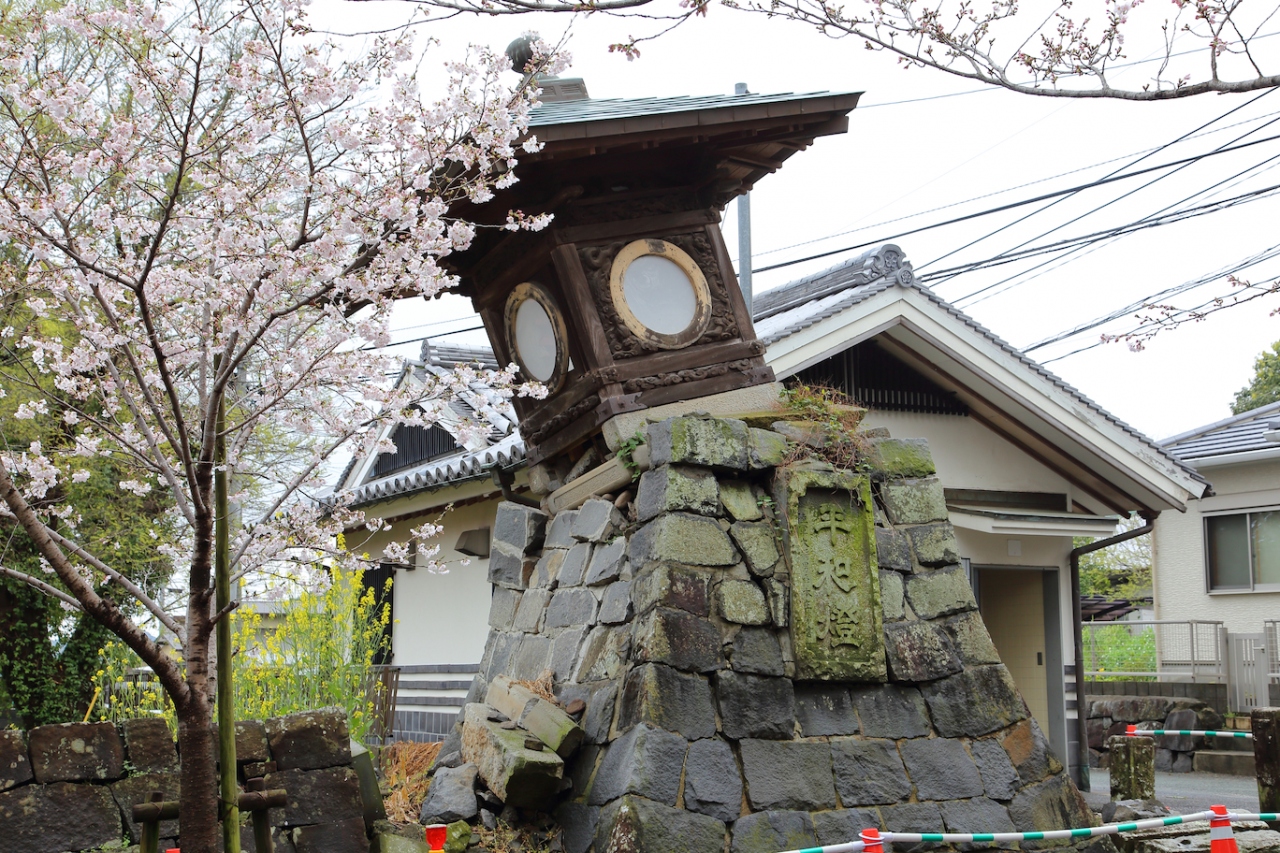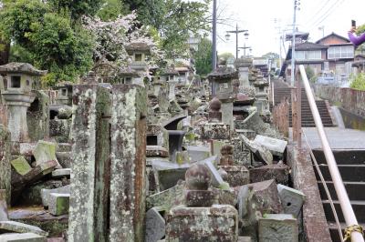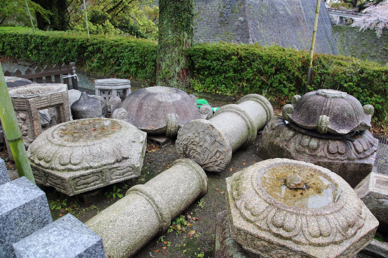 電停なりバス停から向かっていくと、まず、コンクリート製の大きな白い仁王門が見えます。普通、仁王門というと仁王様は1階部分に居ると思うのですが、こちらは2階部分に鎮座しています。特徴的な建物ですが、土台の部分がやられている様で、潜り抜けは出来ません。仁王門を迂回して進むと桜並木の参道が続いていますが、各寺院とも石垣や墓石が倒れています。本妙寺の本堂は特に壊れている様子は見えませんでしたが、参道の時計台は崩壊していました。桜が満開に近い状態だったので、余計に悲惨さが増していました。浄池廟に向かう胸突雁木も中央の石灯籠が倒れていて、震災の爪痕をまざまざと見せ付けられます。浄池廟は破損しているようには身えませんでしたが、その先にある清正公の銅像に続く階段の両脇の灯篭は倒れていました。過去にも訪れたことがあるので、その時と比較すると悲しくなりました。