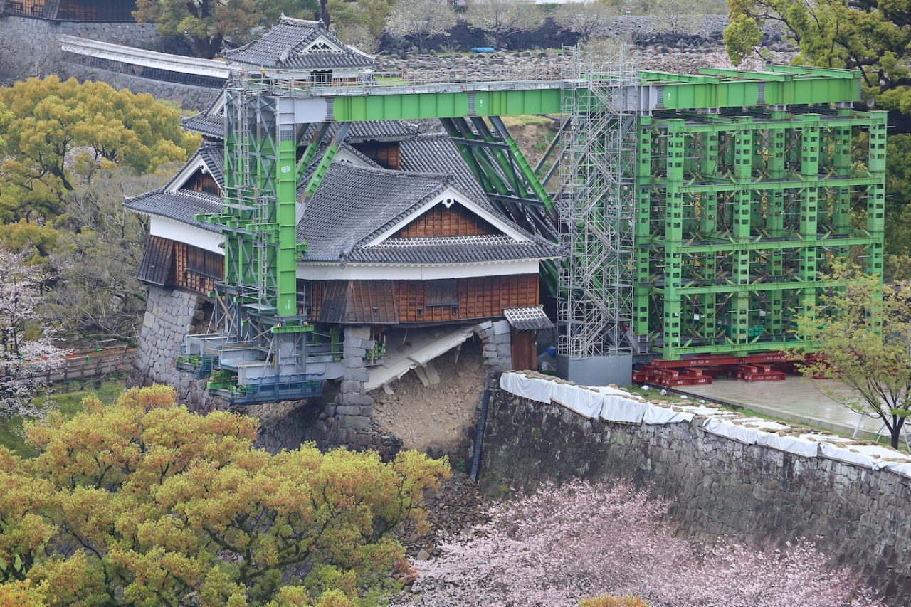 タイトル通り、こちらからは熊本城を見下ろす形で一望できます。当然ながら、熊本城の被害状況も一目で判ります。全体的に石垣が崩れていて酷い有様ですが、特に酷いのが五階櫓で石垣が崩れて床が抜け落ちており、クレーン状のもので支えているのが良く判ります。