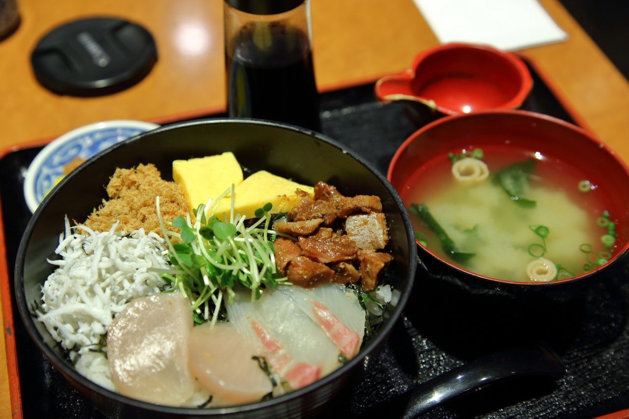 こちらでは漁師のまかない丼を頼みました。幾つかの刺身のほか、漬けやシラスの釜揚げなども入っています。もう少し刺身が入っていると嬉しかったのですが、まぁ¥980でしたからこんなものでしょう。味は普通に美味しく食べられました。量も多からず少なからず、というところだと思います。Suicaでの支払いも出来ましたので、利便性も良いです。- 旅行時期