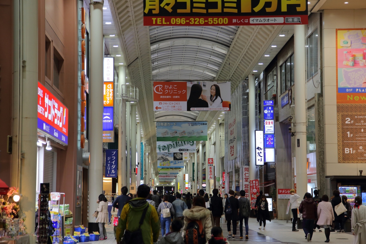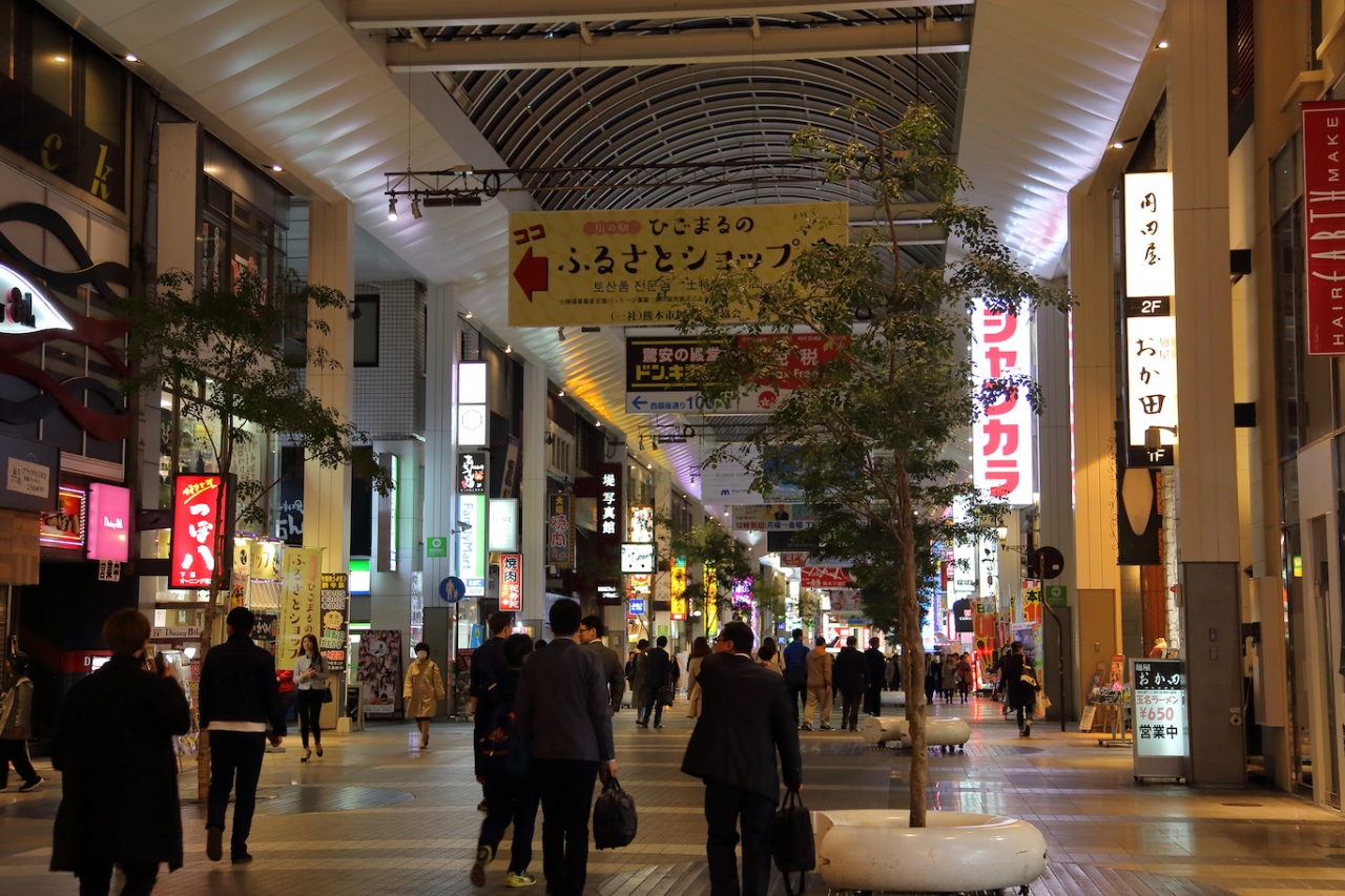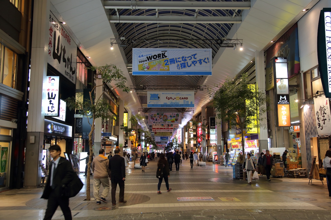 華やかで人通りも多いのですが、店舗はどこでも見かけるようなものが多いです。熊本独自のお店もありますが、それよりは全国チェーンのお店の方が目に付きますね。旅先でも普段と同じお店に行き、同じように楽しむことが出来るわけですが、旅先で非日常を求める方には物足りないかも知れません。地場の居酒屋さんや食事処はメインストリートには面しておらず、路地を入ったところにあります。個人的には、食事も土産物探しも全部こちらで済ませることが出来たので、重宝しました。- 旅行時期